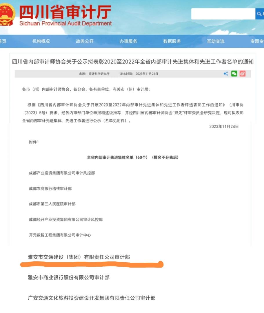 雅安交建集團黨委高度重視內(nèi)部審計工作,公司成立獨立內(nèi)審機構(gòu),由集團黨委書記、董事長直接分管,按照內(nèi)審計劃和黨委、董事會安排,獨立開展工作,并定期向黨委、董事會匯報內(nèi)審工作開展情況。近年來,公司已建立《內(nèi)部審計工作管理辦法》《經(jīng)濟責(zé)任審計實施細則》等內(nèi)部審計制度,通過全面審計、專項審計和“1+N”內(nèi)部監(jiān)督檢查工作機制,規(guī)范集團及子公司制度建設(shè),提升管理水平,助力集團創(chuàng)建“千億國企,品質(zhì)交建”。