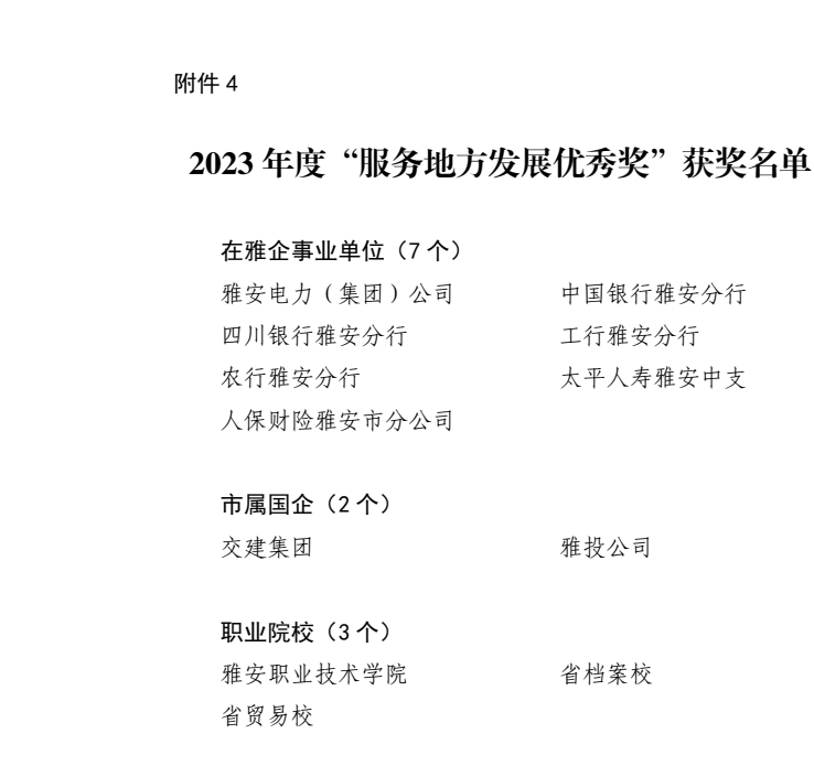 近日,中共雅安市委辦公室、雅安市人民政府辦公室印發(fā)《關(guān)于2023年度縣(區(qū))、市級(jí)部門(mén)和單列考評(píng)單位目標(biāo)績(jī)效綜合考評(píng)結(jié)果的通報(bào)》,雅安交建集團(tuán)獲得2023年度“服務(wù)地方發(fā)展優(yōu)秀獎(jiǎng)”。
