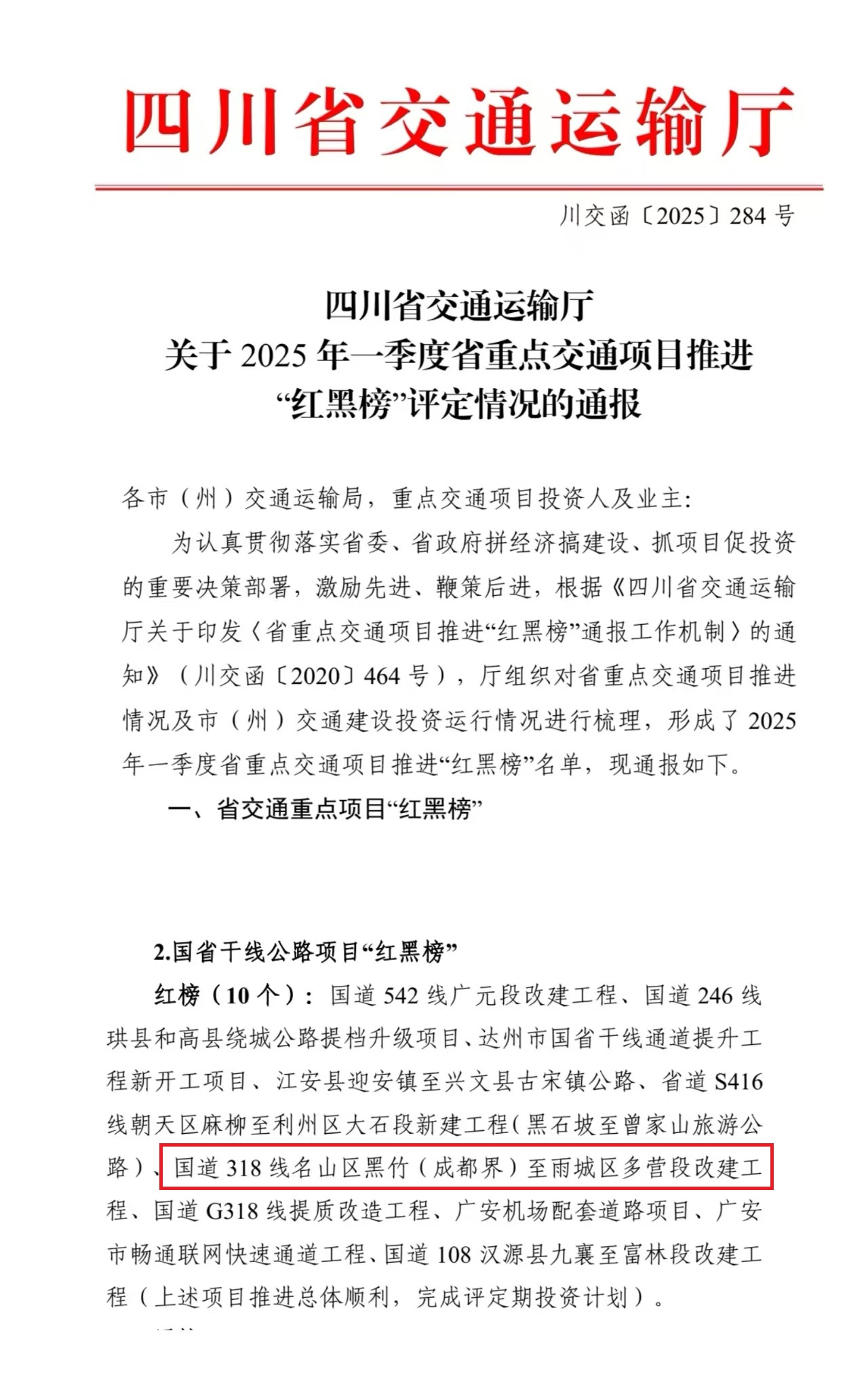 近日,四川省交通運輸廳發(fā)布2025年一季度省重點交通項目推進“紅黑榜”評選結(jié)果,由雅安交建集團四川康藏路橋有限責任公司承建的國道318線名山區(qū)黑竹(成都界)至雨城區(qū)多營段改建工程憑借超額完成投資計劃、關(guān)鍵節(jié)點取得突破等成效,成功入選國省干線公路項目“紅榜”。