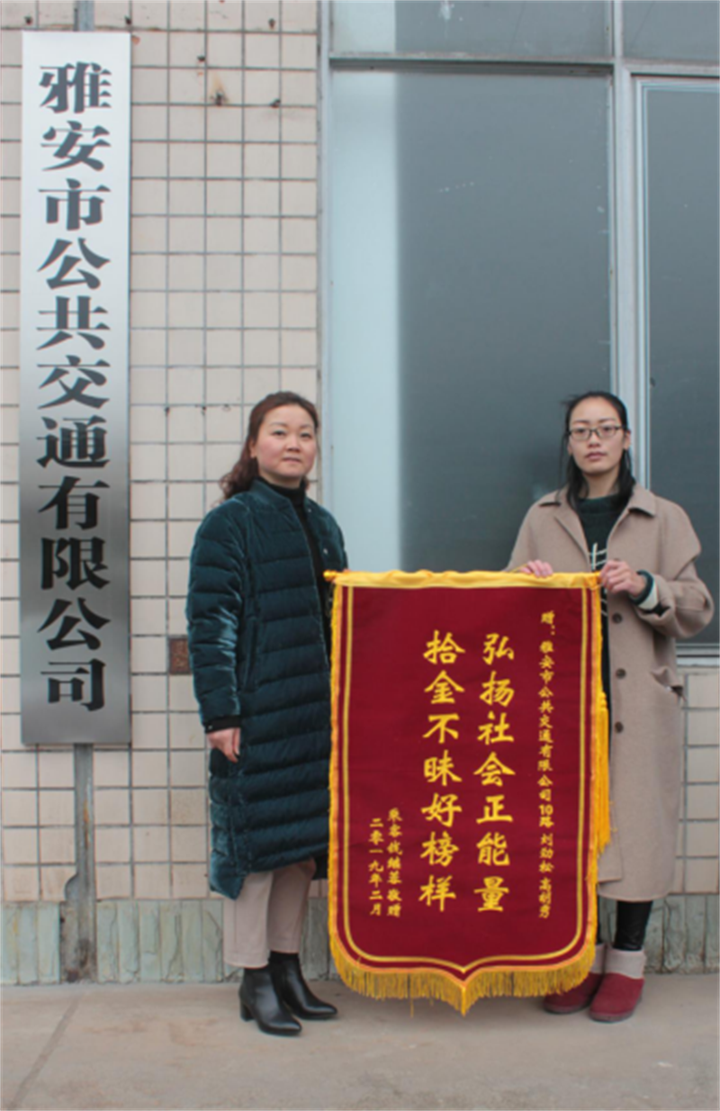 “請(qǐng)一定把我們的感謝帶給駕駛員和發(fā)班員!2月14日下午17時(shí)15分左右,一名手拿寫著“拾金不昧好榜樣弘揚(yáng)社會(huì)正能量”錦旗的市民錢續(xù)露來(lái)到雅安市公共交通有限公司,將錦旗送到了經(jīng)理助理方媛手上,請(qǐng)她把感謝之意轉(zhuǎn)達(dá)給10路公交車駕駛員劉進(jìn)松和發(fā)班員高胡秀。