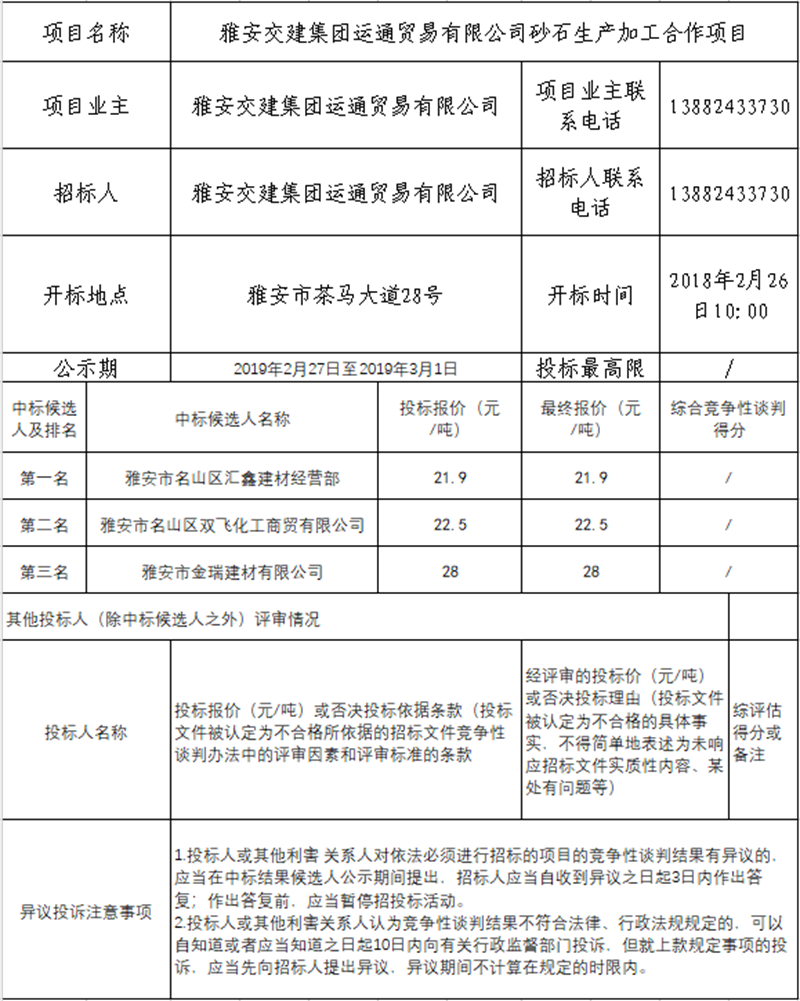 雅安交建集團(tuán)運(yùn)通貿(mào)易有限公司砂石生產(chǎn)加工合作項目競爭性談判結(jié)果公示