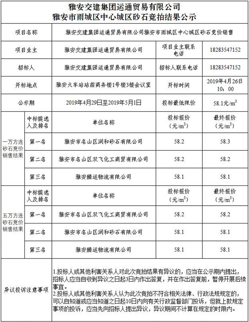雅安交建集團運通貿(mào)易有限公司雨城區(qū)中心城區(qū)砂石競拍結(jié)果公示