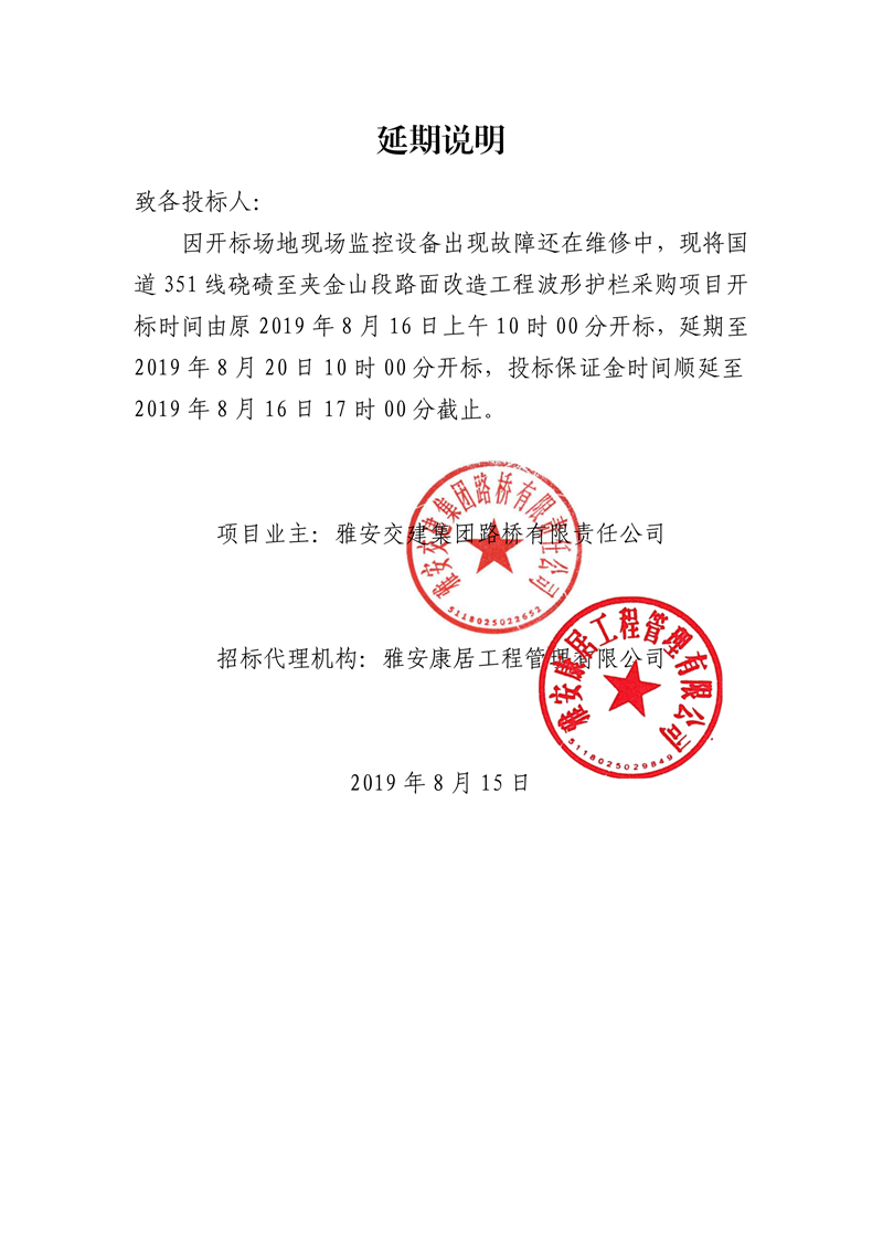 雅安交建集團(tuán)路橋有限責(zé)任公司國道351線磽磧至夾金山段路面改造工程波形護(hù)欄采購延期說明