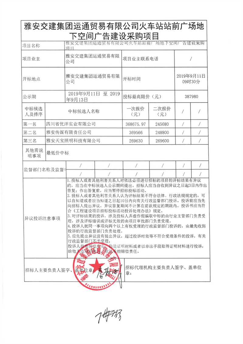雅安交建集團(tuán)運(yùn)通貿(mào)易有限公司火車站站前廣場(chǎng)地下空間廣告建設(shè)采購項(xiàng)目結(jié)果公示