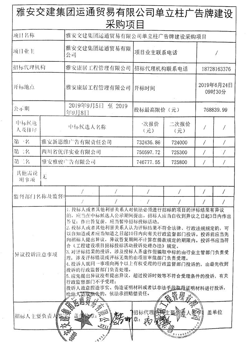 雅安交建集團(tuán)運通貿(mào)易有限公司單立柱廣告牌建設(shè)采購項目競爭性談判結(jié)果公示
