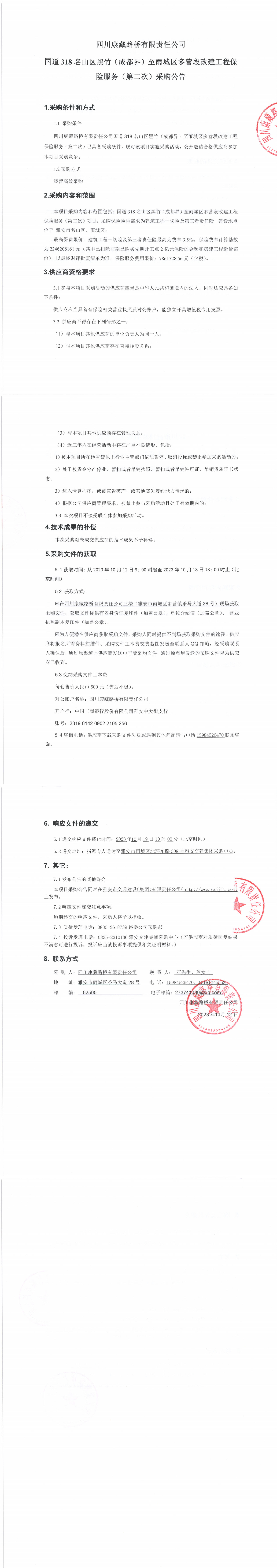 四川康藏路橋有限責(zé)任公司國(guó)道318名山區(qū)黑竹(成都界)至雨城區(qū)多營(yíng)段改建工程保險(xiǎn)服務(wù)(第二次)采購公告