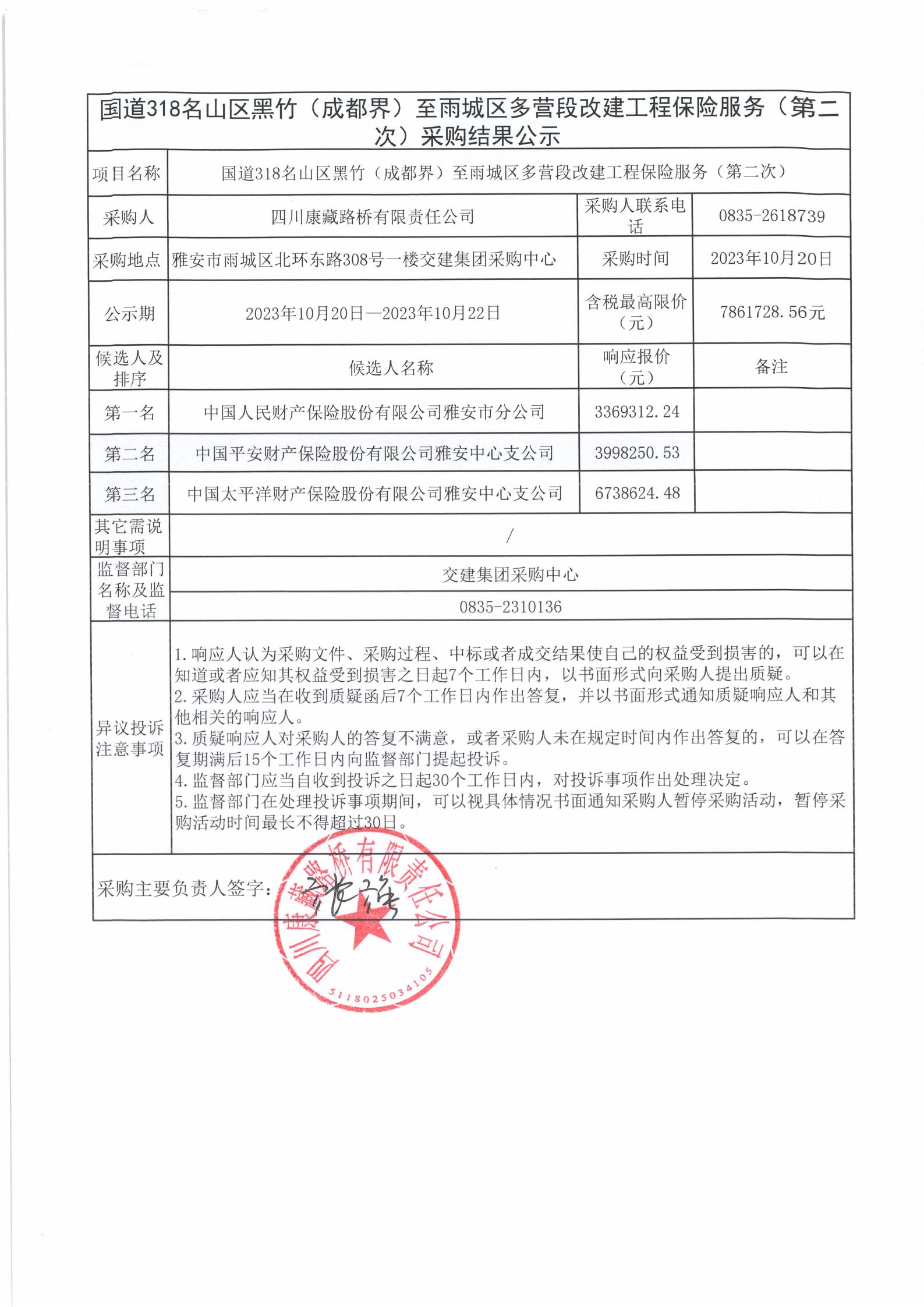 四川康藏路橋有限責任公司國道318名山區(qū)黑竹(成都界)至雨城區(qū)多營段改建工程保險服務(第二次)采購結(jié)果公示