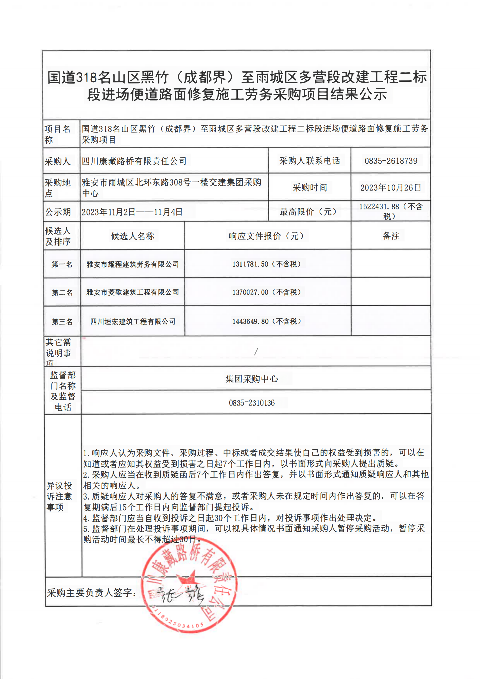 四川康藏路橋有限責(zé)任公司國(guó)道318名山區(qū)黑竹(成都界)至雨城區(qū)多營(yíng)段改建工程二標(biāo)段進(jìn)場(chǎng)便道路面修復(fù)施工勞務(wù)采購(gòu)項(xiàng)目結(jié)果公示