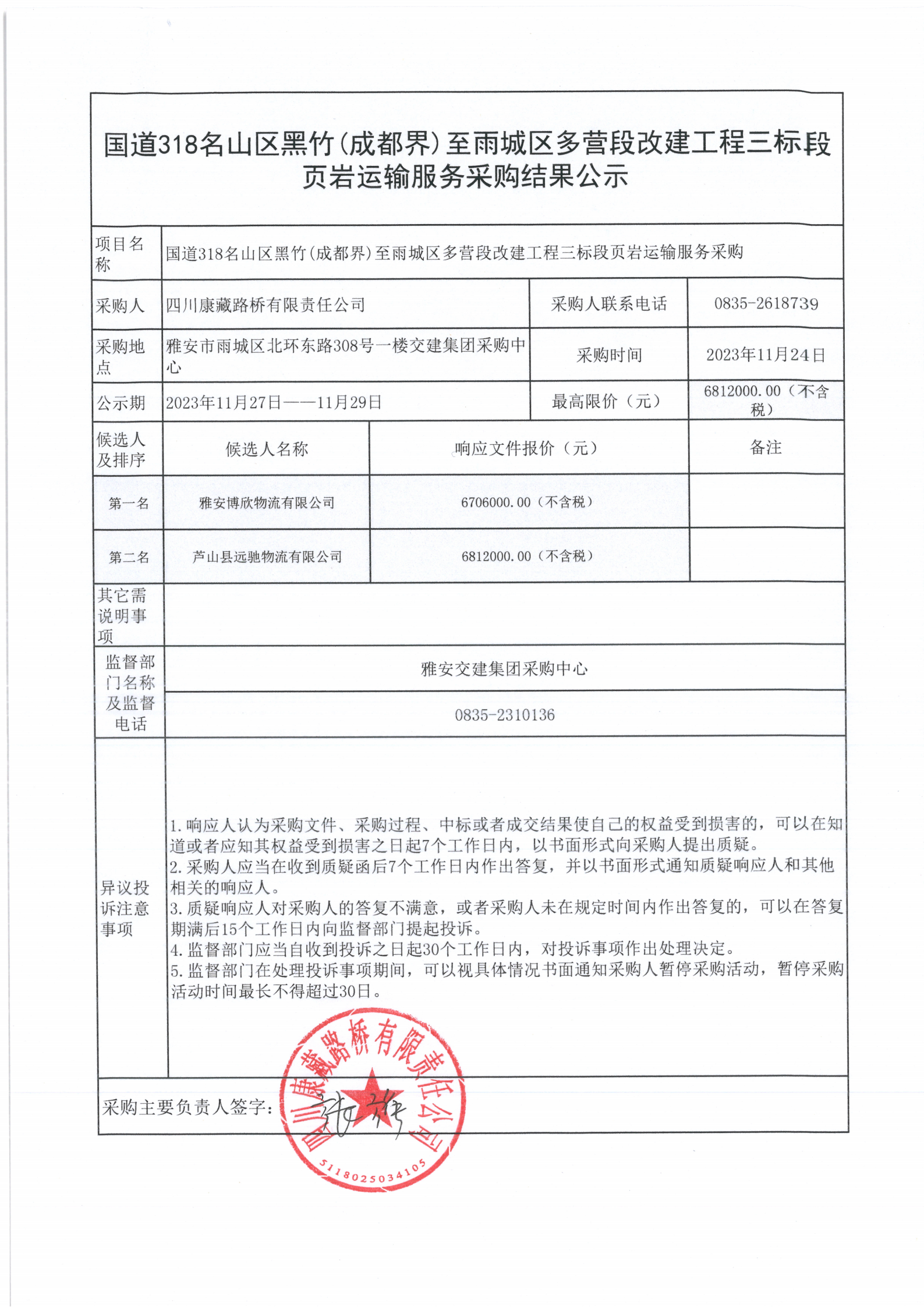 四川康藏路橋有限責任公司國道318名山區(qū)黑竹(成都界)至雨城區(qū)多營段改建工程三標段頁巖運輸服務采購結(jié)果公示