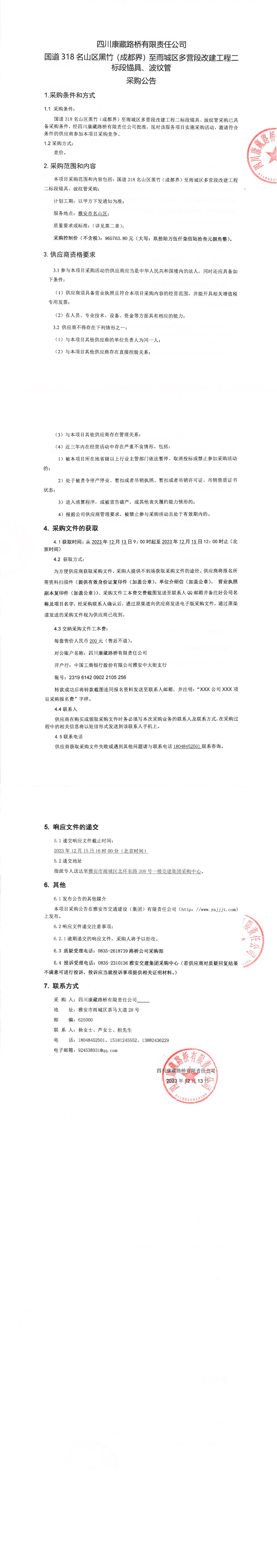 四川康藏路橋有限責任公司國道318名山區(qū)黑竹(成都界)至雨城區(qū)多營段改建工程二標段錨具、波紋管采購公告