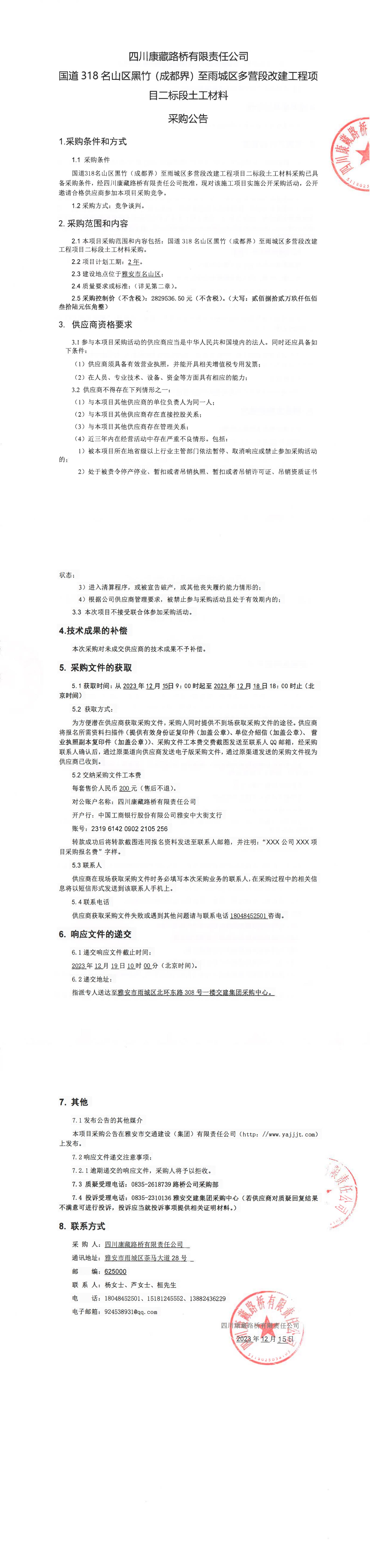 四川康藏路橋有限責任公司G318線雨城區(qū)水廠至藏茶村入口段中修專業(yè)分包工程競爭談判結果公示