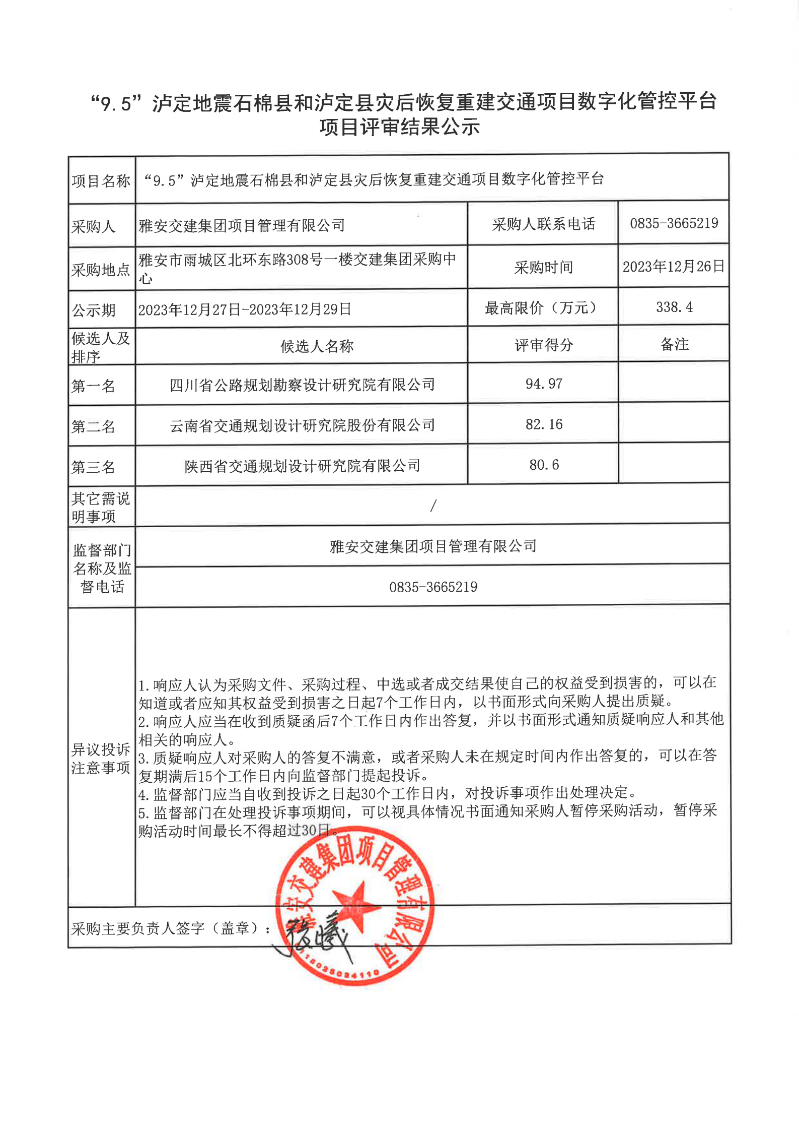 雅安交建集團項目管理有限公司“9.5”瀘定地震石棉縣和瀘定縣災(zāi)后恢復(fù)重建交通項目數(shù)字化管控平臺項目評審結(jié)果公示