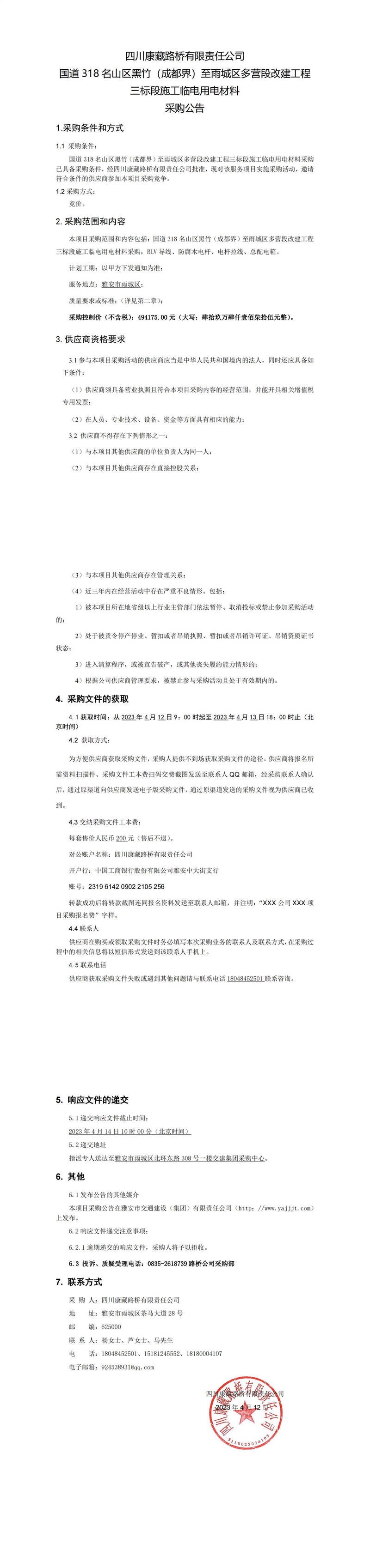 四川康藏路橋有限責(zé)任公司國道318名山區(qū)黑竹(成都界)至雨城區(qū)多營段改建工程三標(biāo)段施工臨電用電材料采購公告