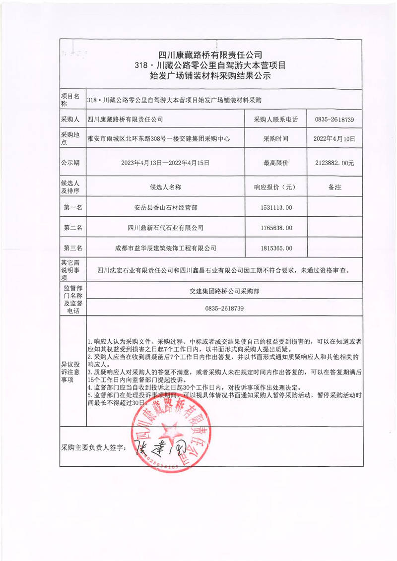四川康藏路橋有限責(zé)任公司318·川藏公路零公里自駕游大本營(yíng)項(xiàng)目始發(fā)廣場(chǎng)鋪裝材料采購結(jié)果公示