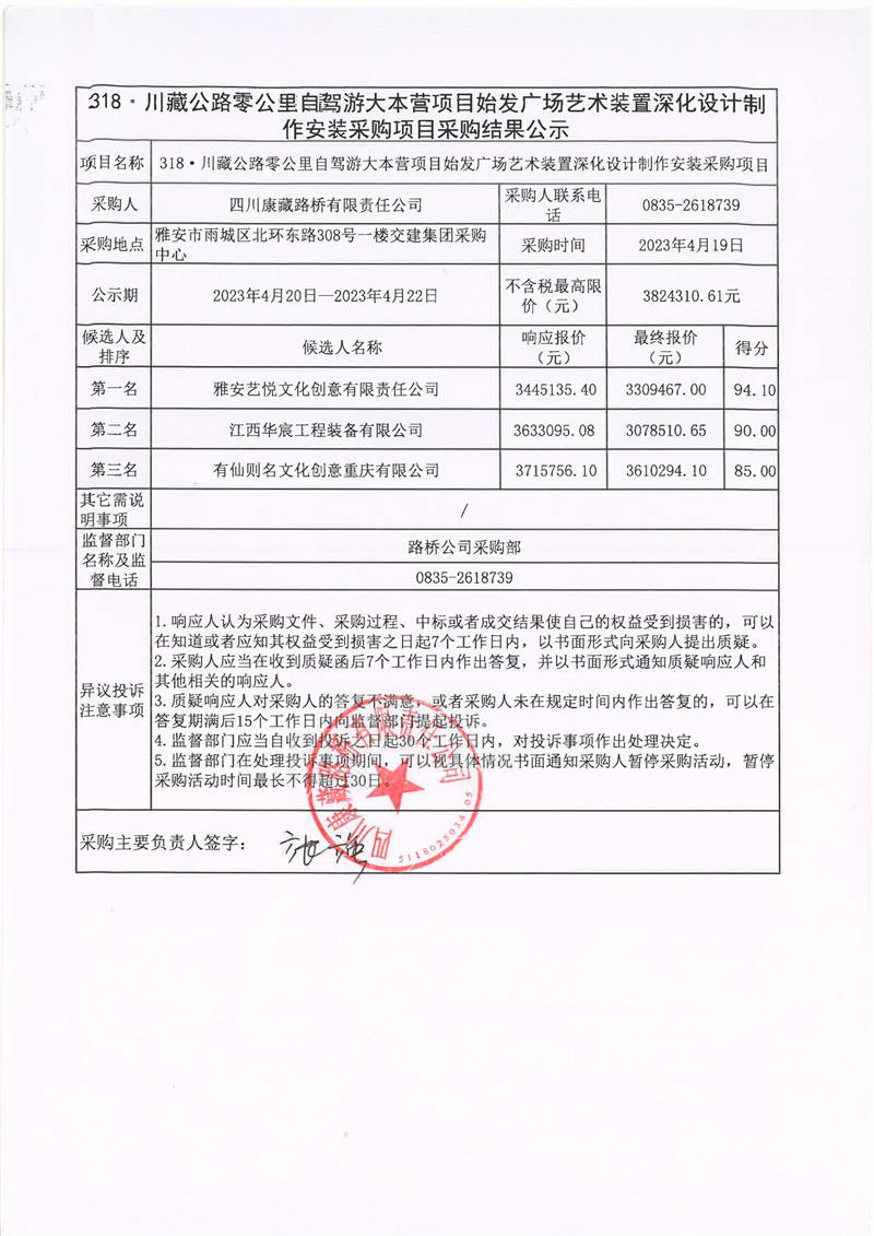 四川康藏路橋有限責(zé)任公司318·川藏公路零公里自駕游大本營項(xiàng)目始發(fā)廣場(chǎng)藝術(shù)裝置深化設(shè)計(jì)制作安裝采購項(xiàng)目采購結(jié)果公示