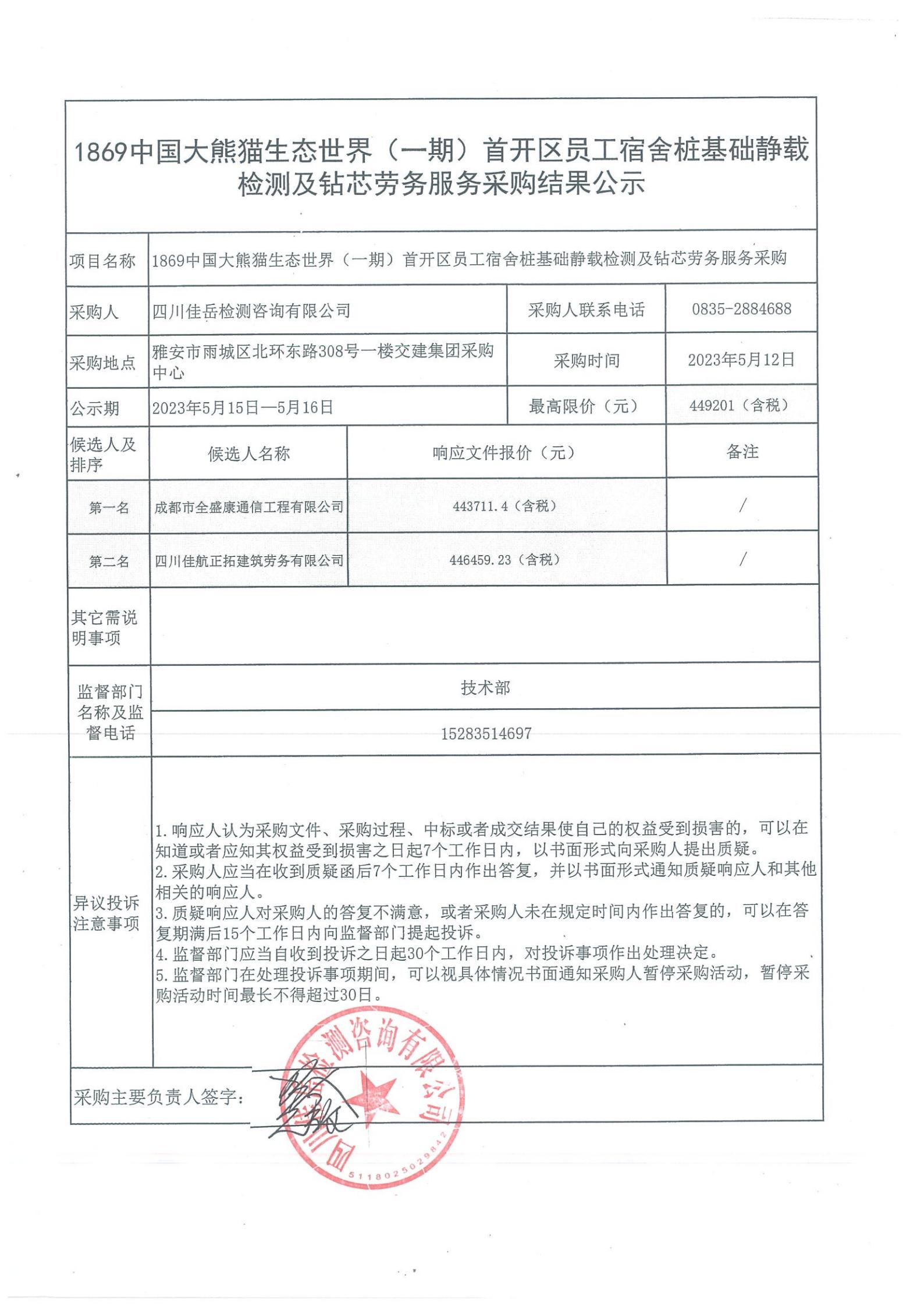 四川佳岳檢測咨詢有限公司關(guān)于1869中國大熊貓生態(tài)世界(一期)首開區(qū)員工宿舍樁基礎靜載檢測勞務及鉆芯項目中標結(jié)果公示
