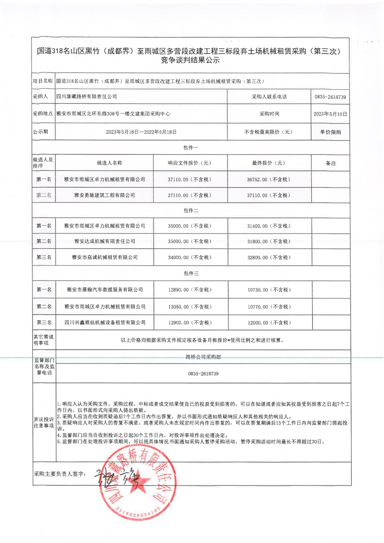 四川康藏路橋有限責(zé)任公司國道318名山區(qū)黑竹(成都界)至雨城區(qū)多營(yíng)段改建工程三標(biāo)段棄土場(chǎng)機(jī)械租賃采購(第三次)競(jìng)爭(zhēng)談判結(jié)果公示