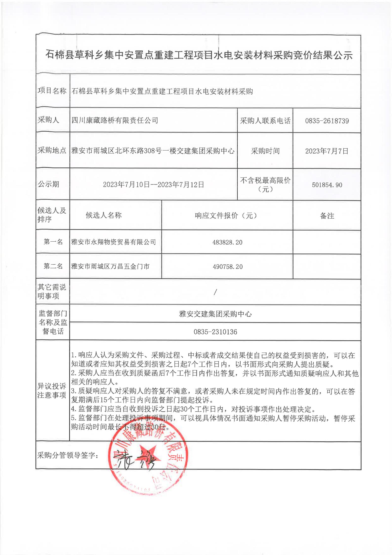 四川康藏路橋有限責(zé)任公司石棉草科鄉(xiāng)集中安置點重建工程項目水電安裝材料采購競價結(jié)果公示