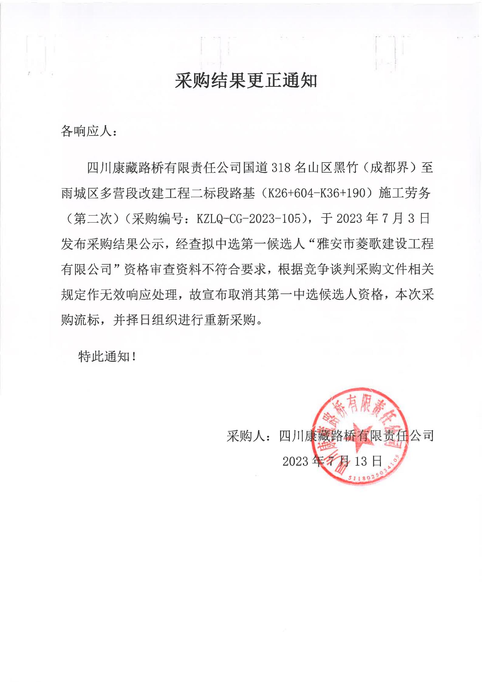 四川康藏路橋有限責任公司國道318名山區(qū)黑竹(成都界)至雨城區(qū)多營段改建工程二標段路基(K26+604-K36+190)施工勞務(wù)(第二次)采購結(jié)果更正通知