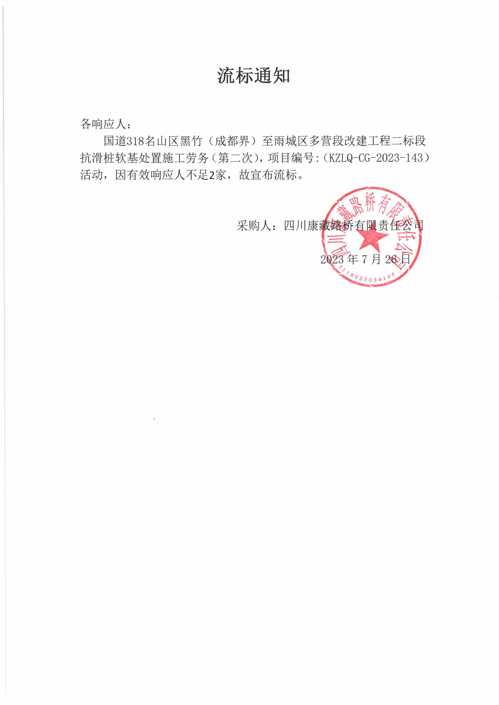 四川康藏路橋有限責(zé)任公司國道318名山區(qū)黑竹(成都界)至雨城區(qū)多營段改建工程二標段抗滑樁軟基處置施工勞務(wù)(第二次)流標通知