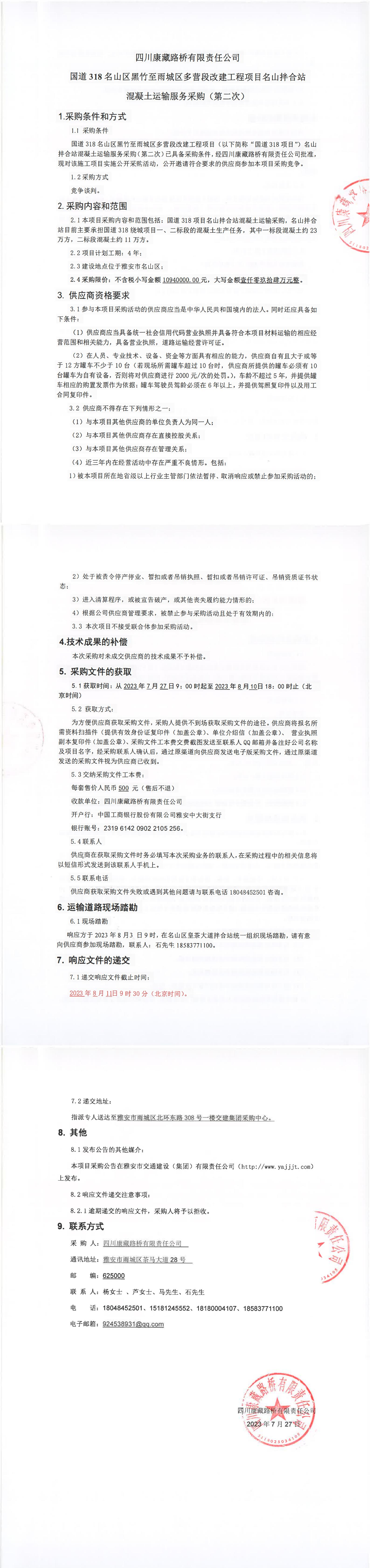 四川康藏路橋有限責(zé)任公司國(guó)道318名山區(qū)黑竹至雨城區(qū)多營(yíng)段改建工程項(xiàng)目名山拌合站混凝土運(yùn)輸服務(wù)采購(gòu)(第二次)