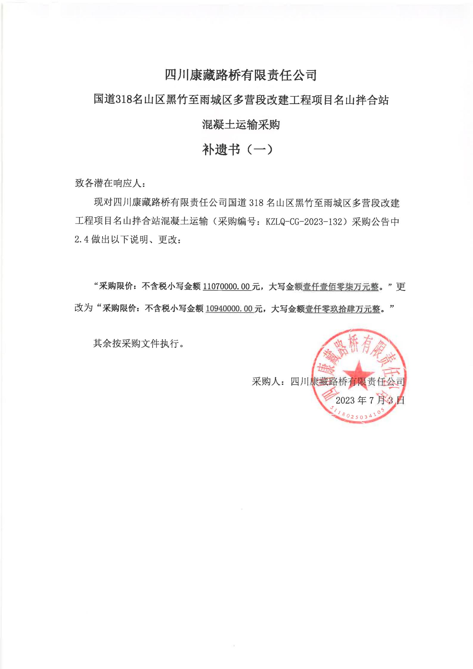 四川康藏路橋有限責任公司國道318名山區(qū)黑竹至雨城區(qū)多營段改建工程項目名山拌合站混凝土運輸服務(wù)采購補遺書