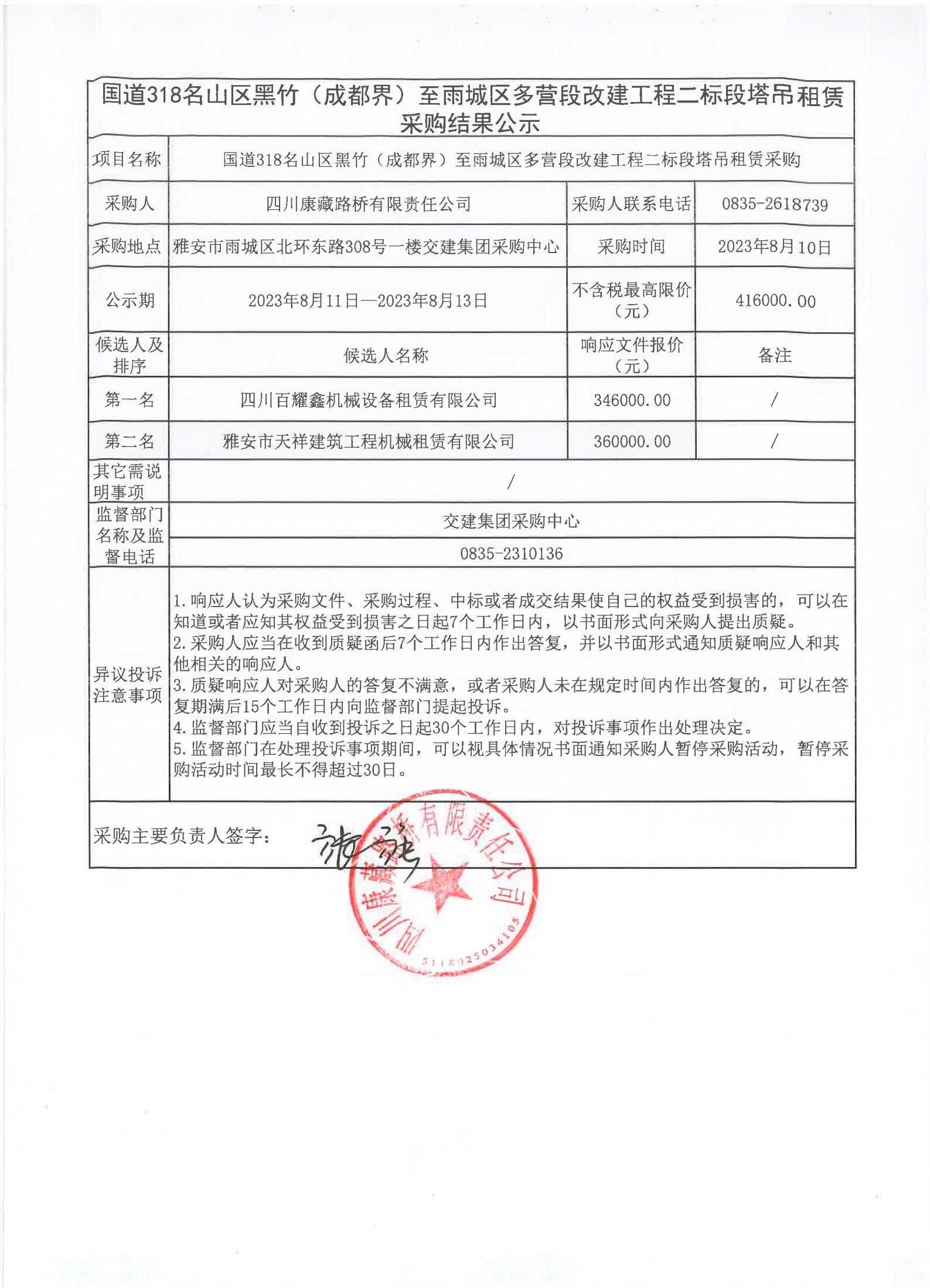 四川康藏路橋有限責任公司國道318名山區(qū)黑竹(成都界)至雨城區(qū)多營段改建工程二標段塔吊租賃采購結(jié)果公示