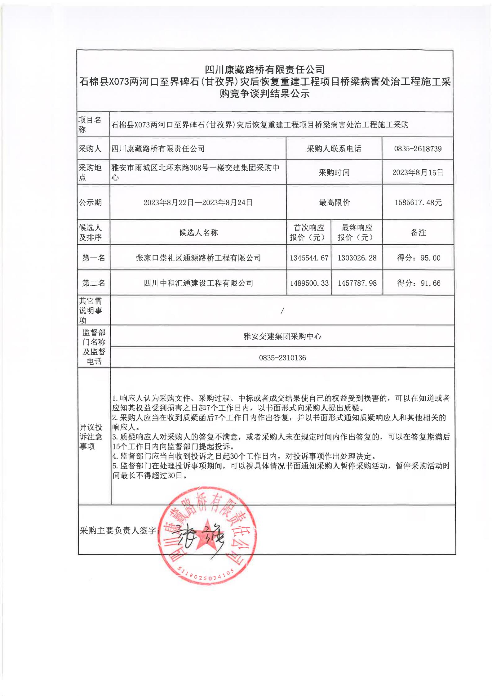 四川康藏路橋有限責任公司石棉縣X073兩河口至界碑石(甘孜界)災后恢復重建工程項目橋梁病害處治工程施工采購競爭談判結(jié)果公示