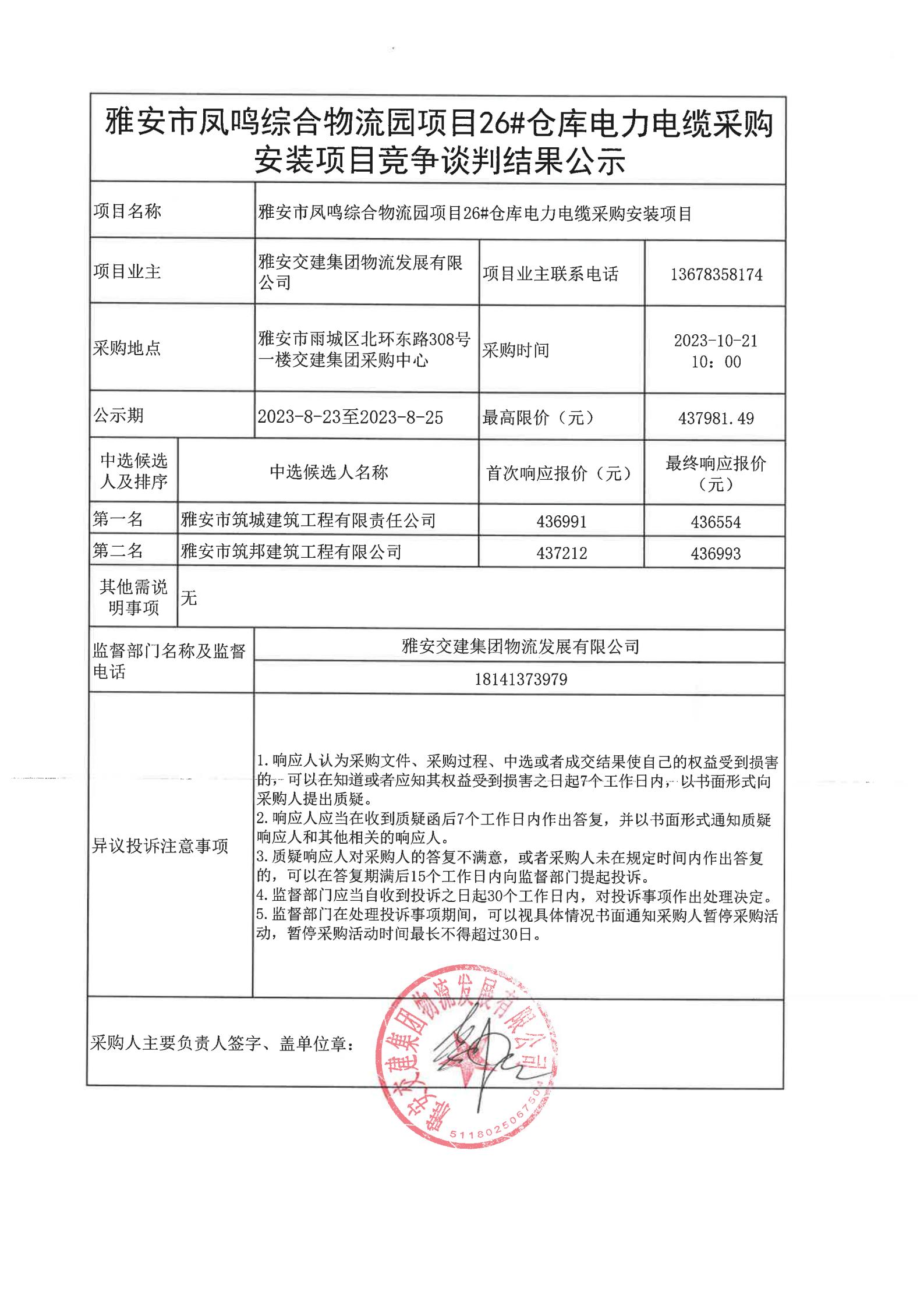 雅安交建集團(tuán)物流發(fā)展有限公司雅安市鳳鳴綜合物流園項目26#倉庫電力電纜采購安裝項目競爭談判結(jié)果公示