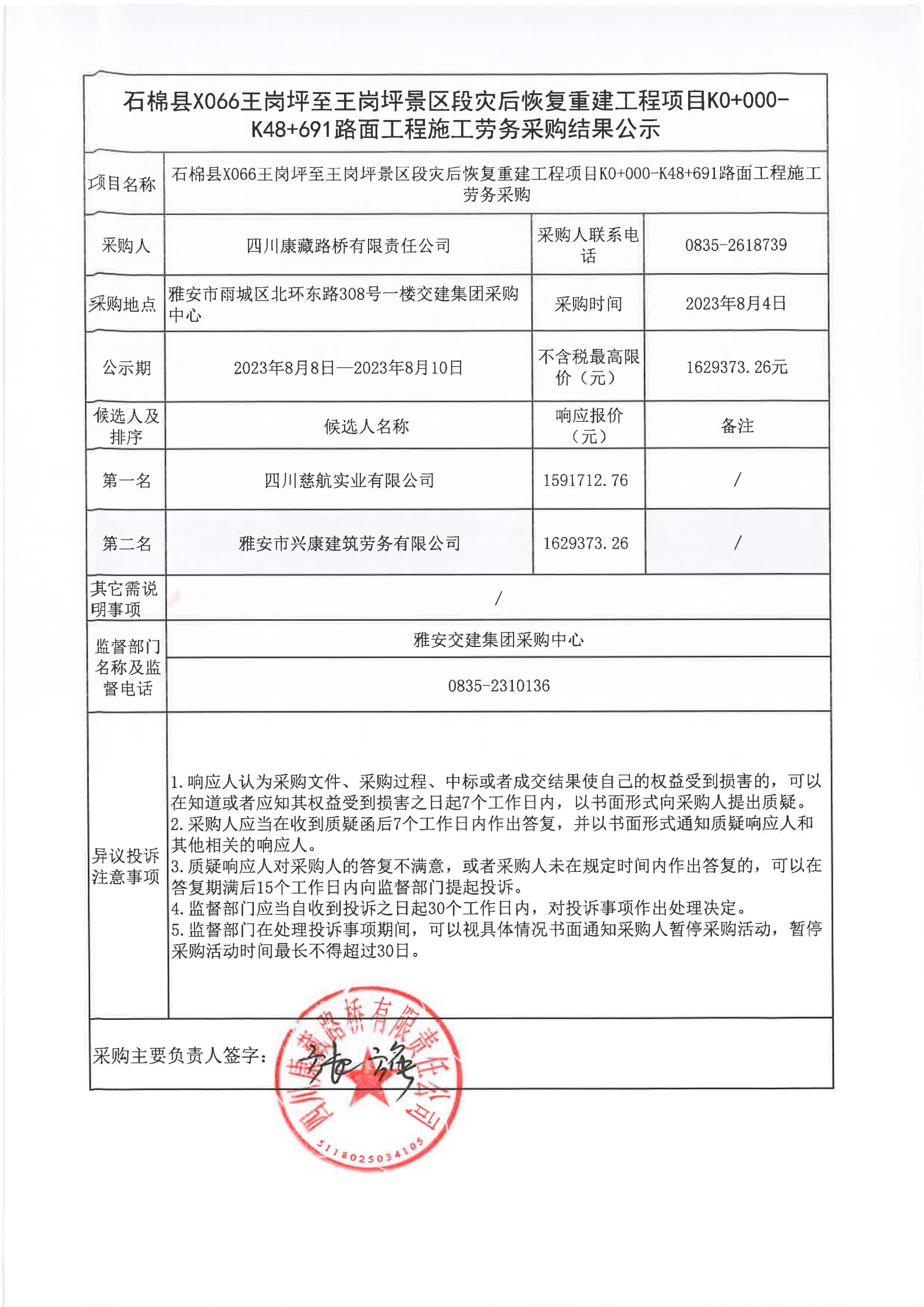 四川康藏路橋有限責(zé)任公司石棉縣X066王崗坪至王崗坪景區(qū)段災(zāi)后恢復(fù)重建工程項(xiàng)目K0+000-K48+691路面工程施工勞務(wù)采購(gòu)結(jié)果公示
