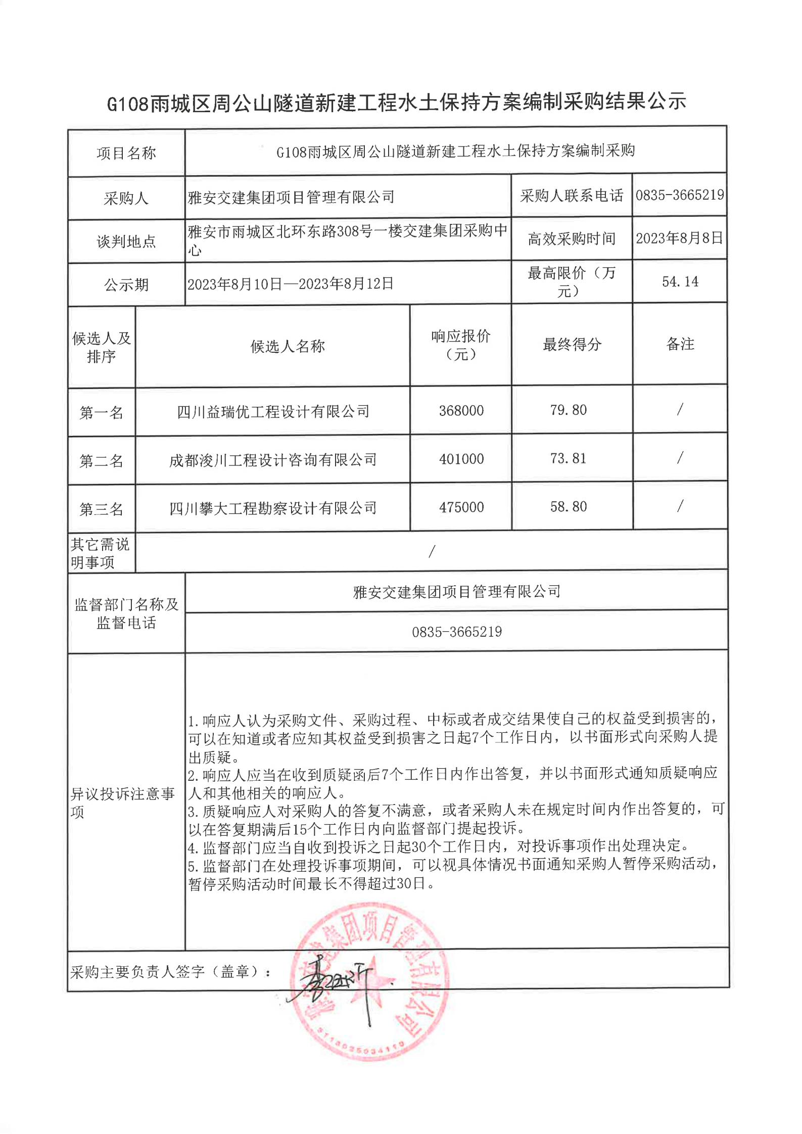 雅安交建集團(tuán)項(xiàng)目管理有限公司G108雨城區(qū)周公山隧道新建工程水土保持方案編制采購結(jié)果公示