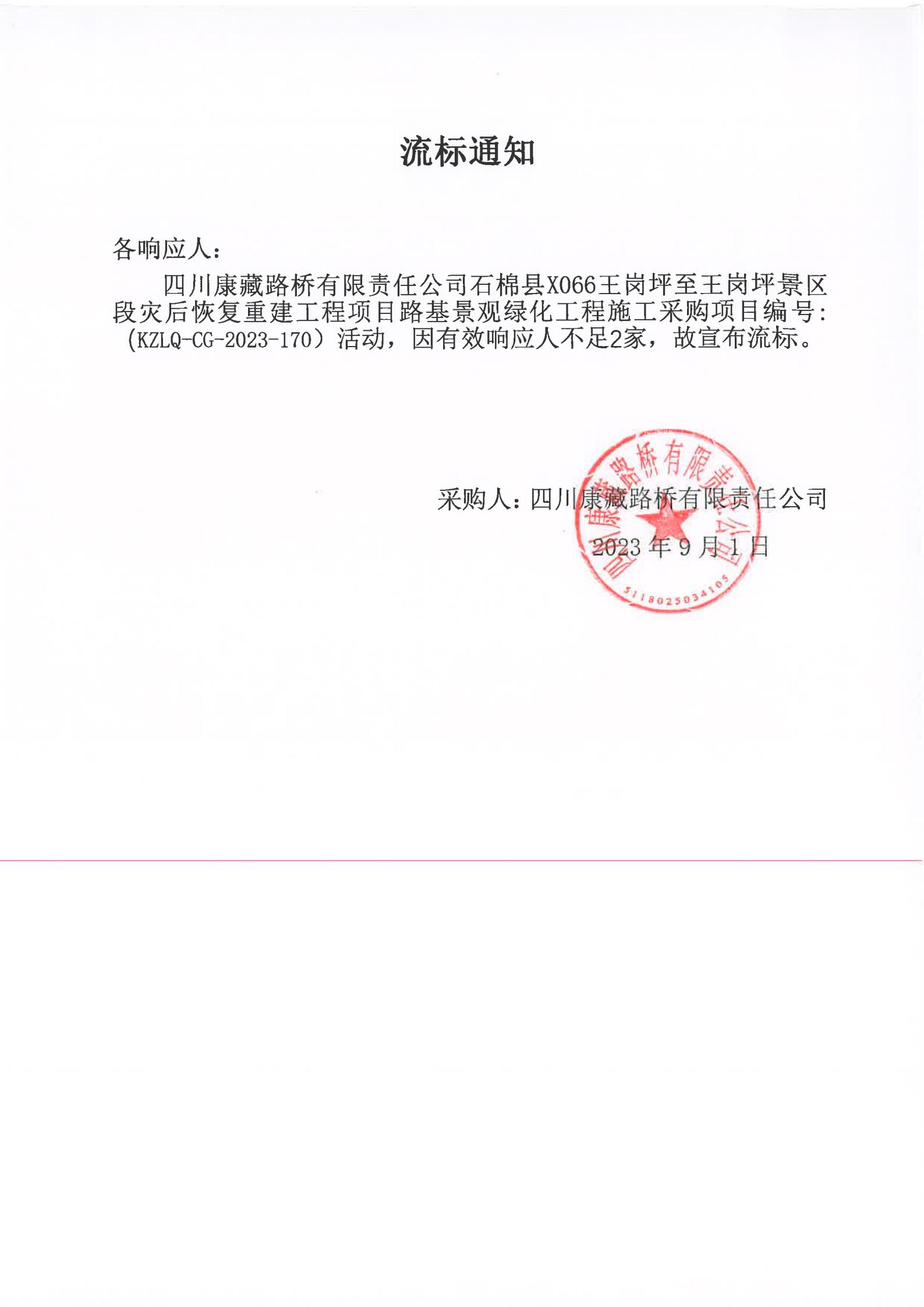 四川康藏路橋有限責(zé)任公司石棉縣X066王崗坪至王崗坪景區(qū)段災(zāi)后恢復(fù)重建工程項目路基景觀綠化工程施工采購流標(biāo)通知