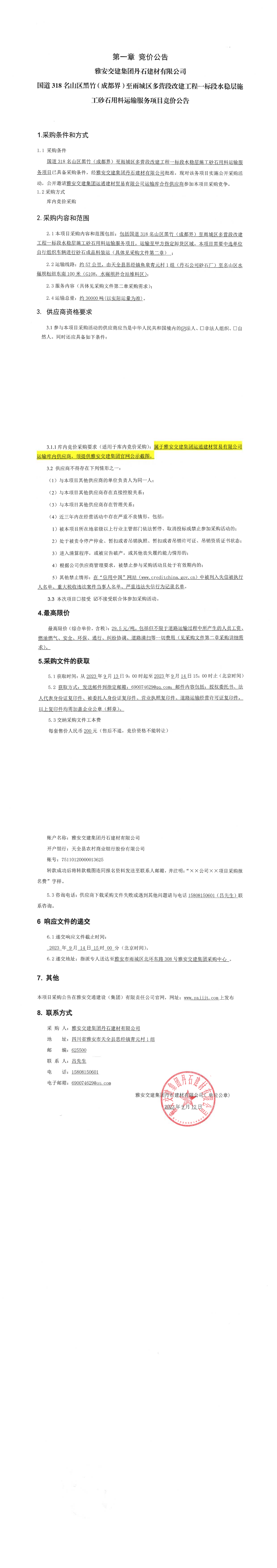 雅安交建集團(tuán)丹石建材有限公司國道318名山區(qū)黑竹(成都界)至雨城區(qū)多營段改建工程一標(biāo)段水穩(wěn)層施工砂石用料運輸服務(wù)項目競價公告