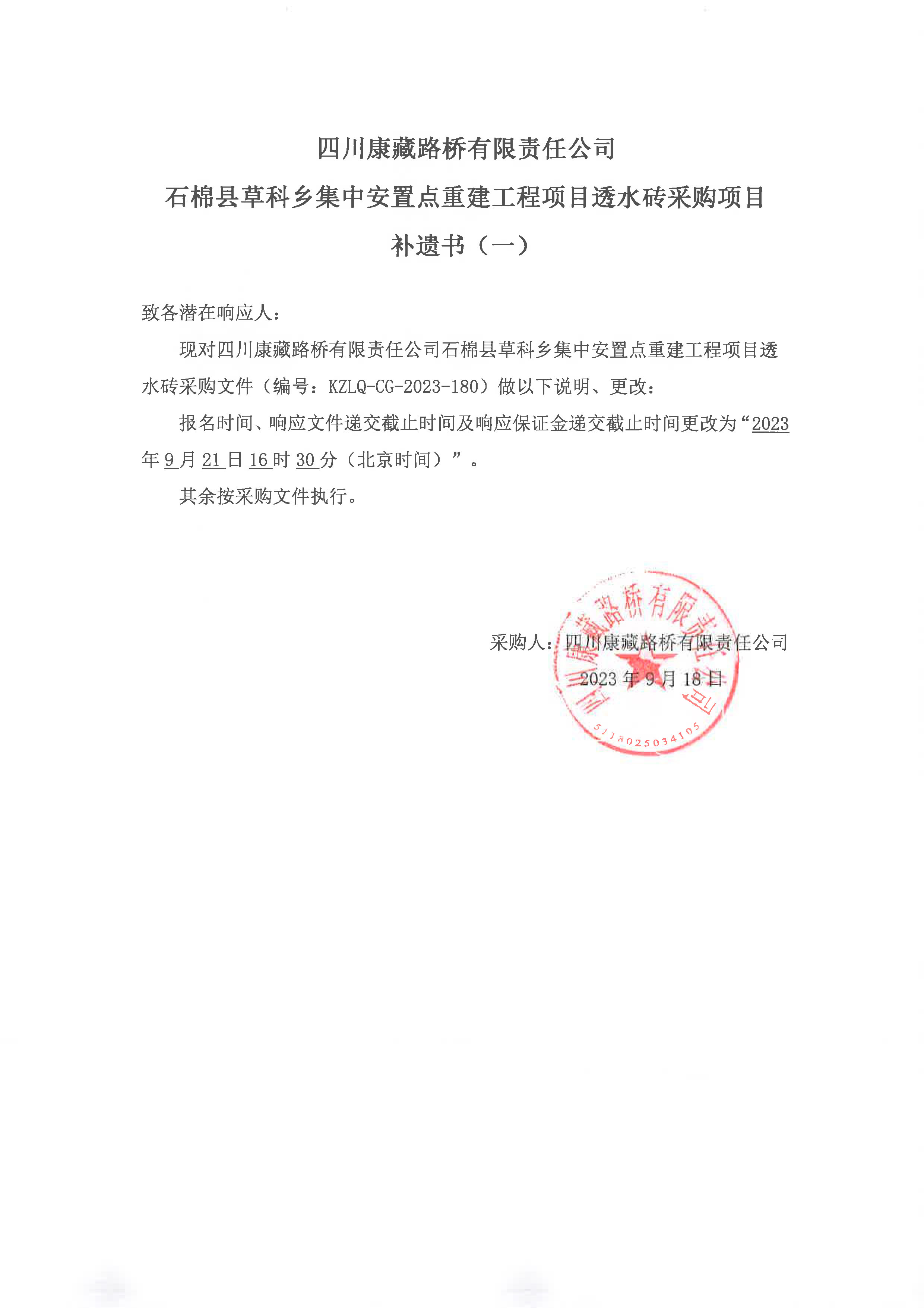 四川康藏路橋有限責(zé)任公司石棉縣草科鄉(xiāng)集中安置點(diǎn)重建工程項目透水磚采購項目補(bǔ)遺書(一)