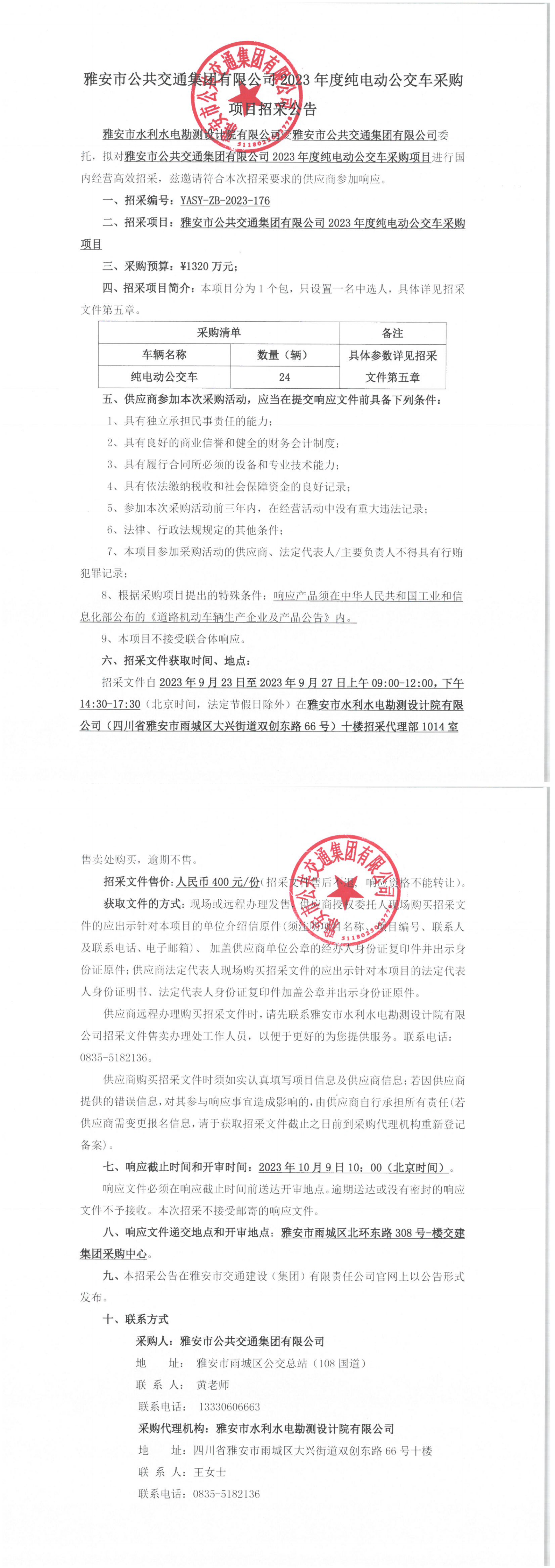 雅安市公共交通集團(tuán)有限公司2023年度純電動(dòng)車(chē)公交車(chē)采購(gòu)項(xiàng)目招采公告