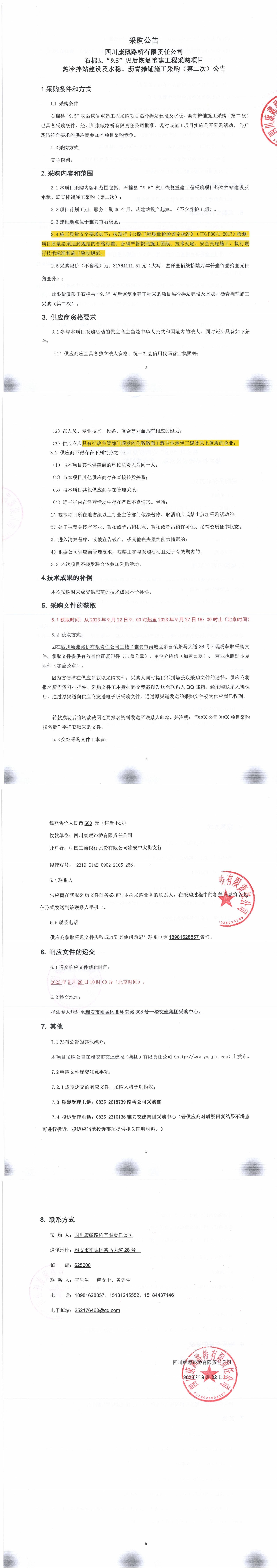 四川康藏路橋有限責任公司石棉縣“9·5”災(zāi)后恢復(fù)重建工程采購項目熱冷拌站建設(shè)及水穩(wěn)、瀝青攤鋪施工采購(第二次)公告
