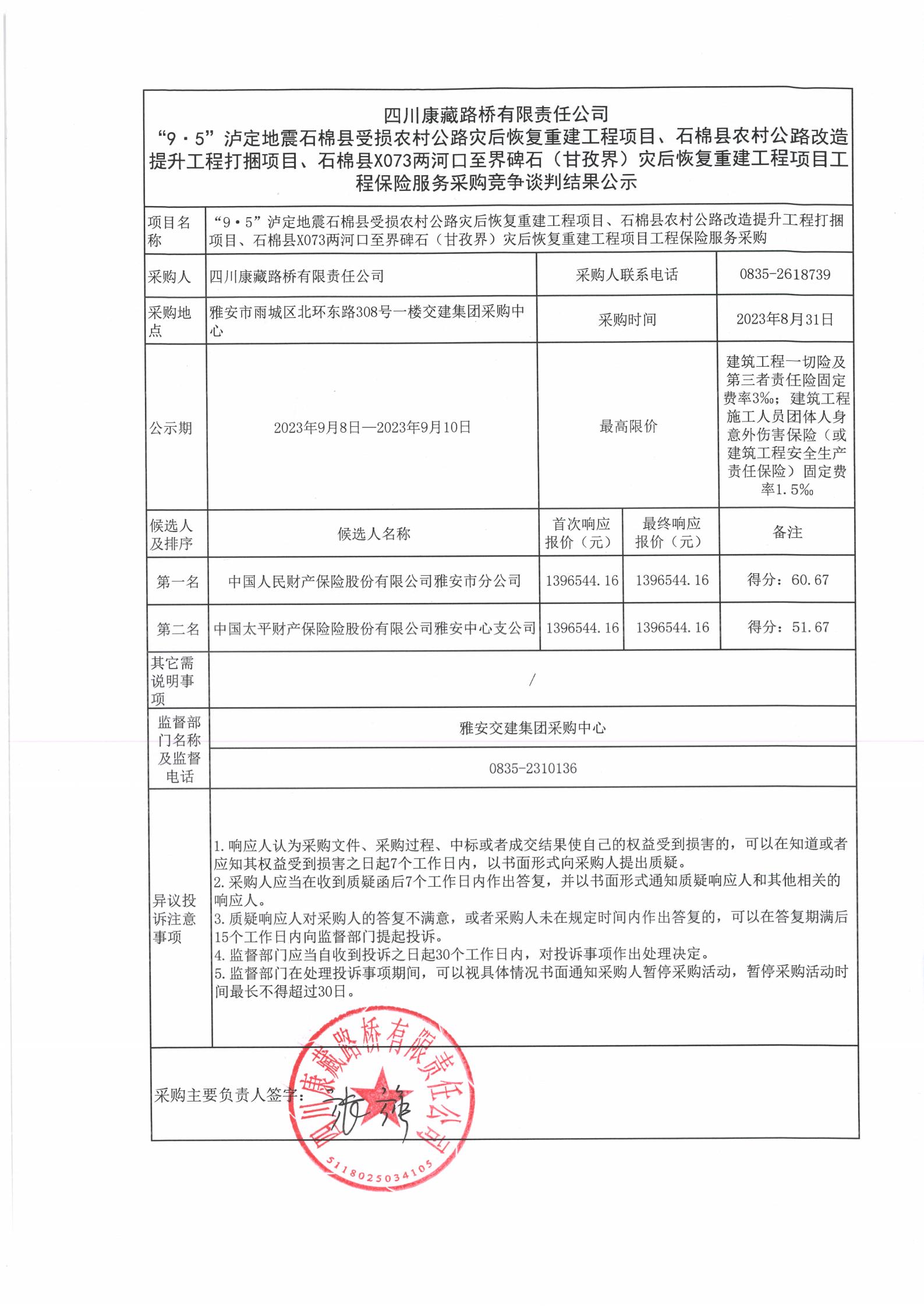 四川康藏路橋有限責(zé)任公司“9·5”瀘定地震石棉縣農(nóng)村公路災(zāi)后恢復(fù)重建工程項(xiàng)目、石棉縣農(nóng)村公路改造提升工程打捆項(xiàng)目、石棉縣X073兩河口至界碑石(甘孜界)災(zāi)后恢復(fù)重建工程項(xiàng)目工程保險服務(wù)采購競爭談判結(jié)果公示
