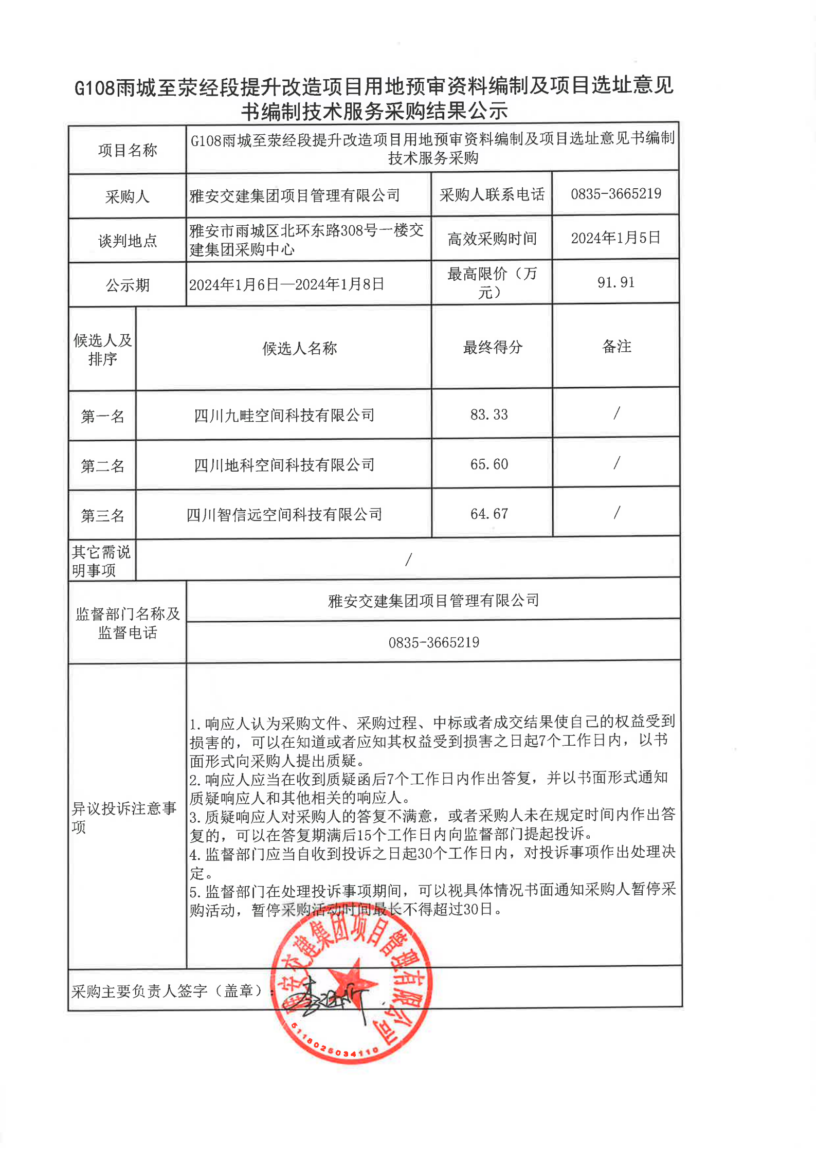 雅安交建集團項目管理有限公司G108雨城至滎經(jīng)段提升改造項目用地預審資料編制及項目選址意見書編制技術服務采購結果公示