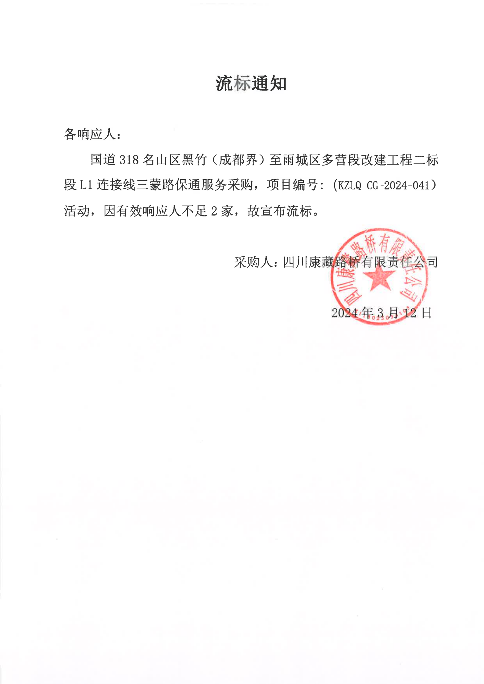四川康藏路橋有限責(zé)任公司國道318名山區(qū)黑竹(成都界)至雨城區(qū)多營段改建工程二標段L1連接線三蒙路保通服務(wù)采購流標通知