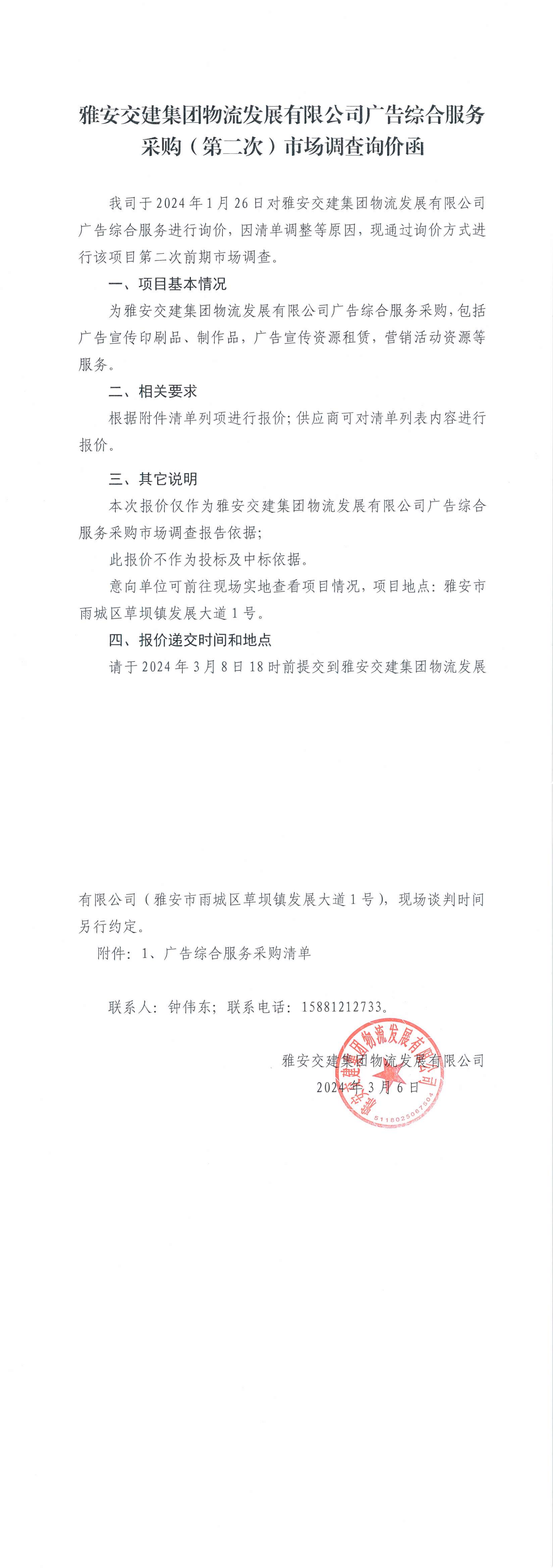 雅安交建集團(tuán)物流發(fā)展有限公司廣告綜合服務(wù)采購(第二次)市場調(diào)查詢價函