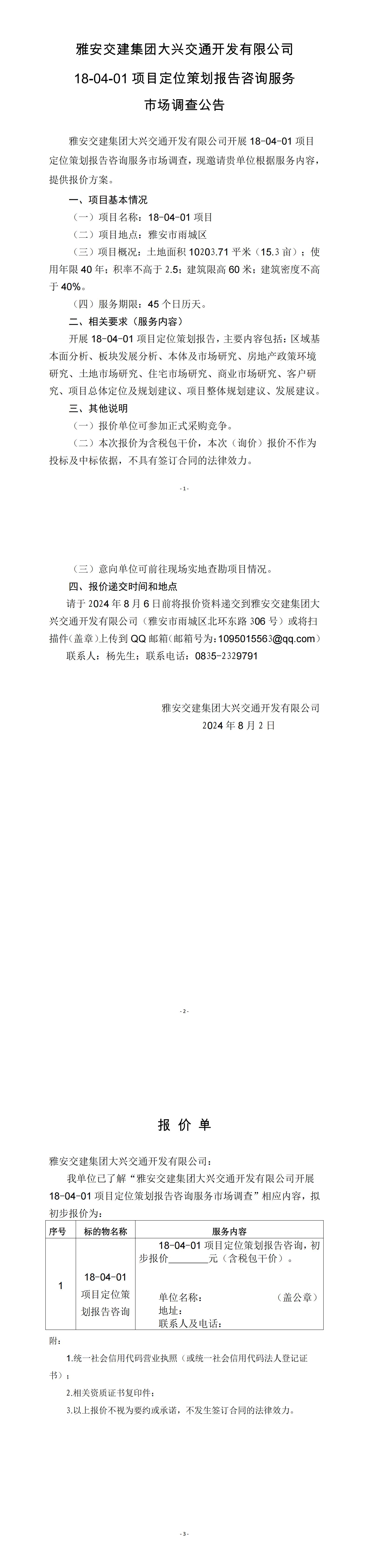 雅安交建集團(tuán)大興交通開發(fā)有限公司18-04-01項目定位策劃報告咨詢服務(wù)市場調(diào)查公告