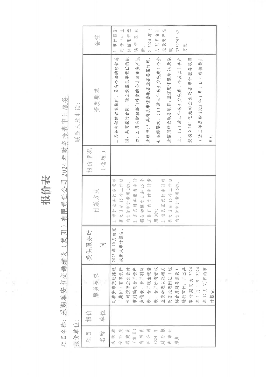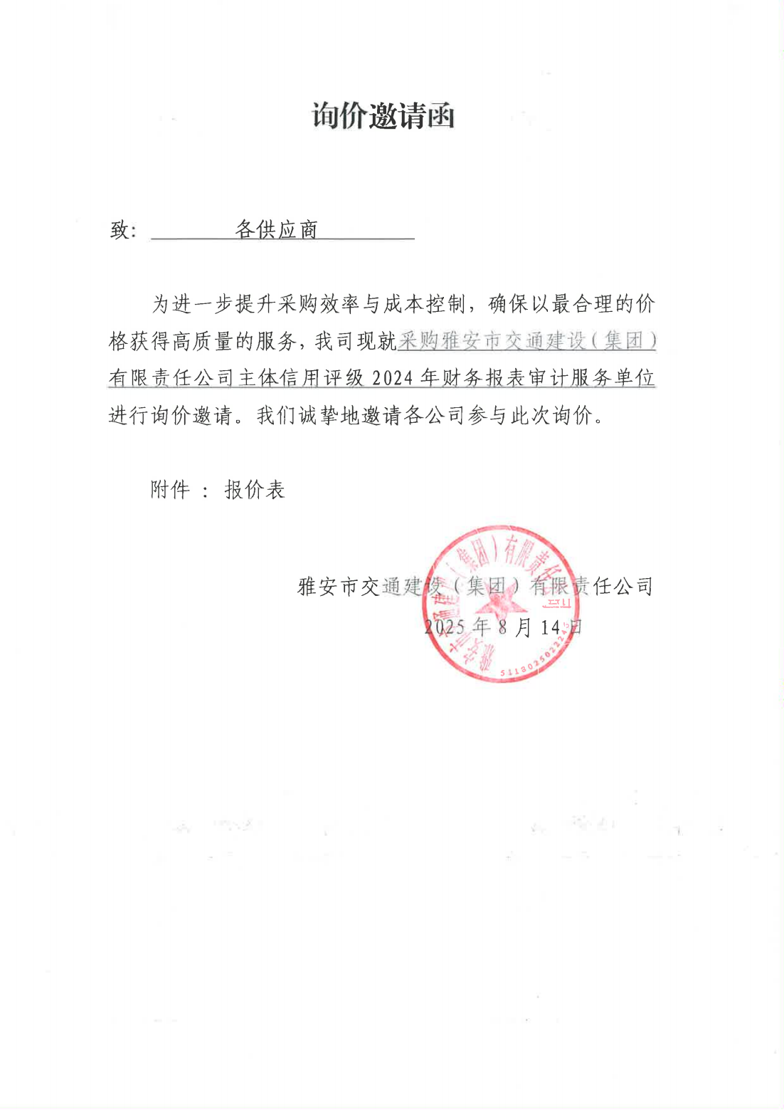 關(guān)于采購雅安市交通建設(shè)(集團(tuán))有限責(zé)任公司主體信用評級2024年財(cái)務(wù)報(bào)表審計(jì)服務(wù)單位的詢價函