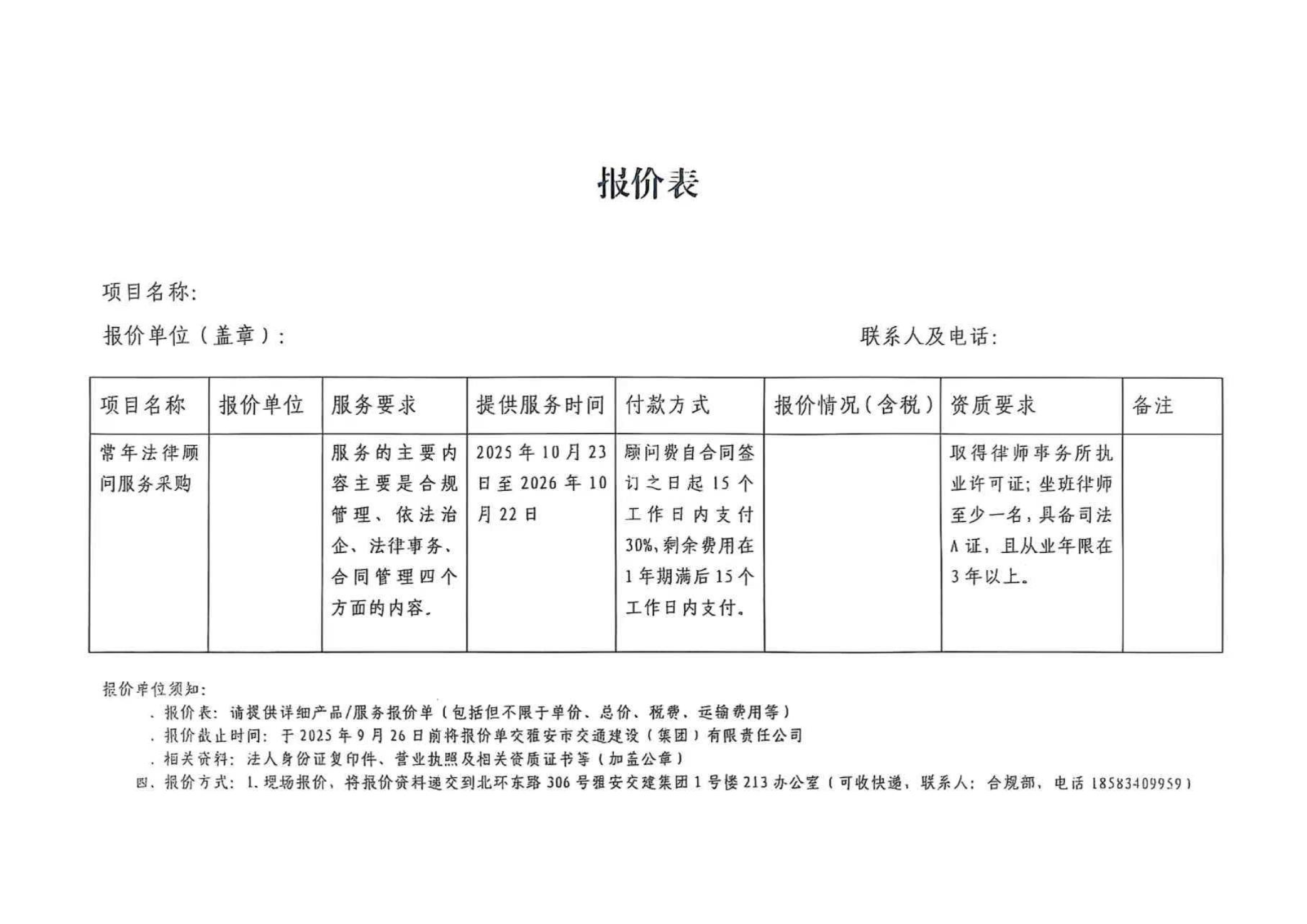 關(guān)于雅安市交通建設(shè)(集團(tuán))有限責(zé)任公司常年法律顧問(wèn)服務(wù)的詢(xún)價(jià)函