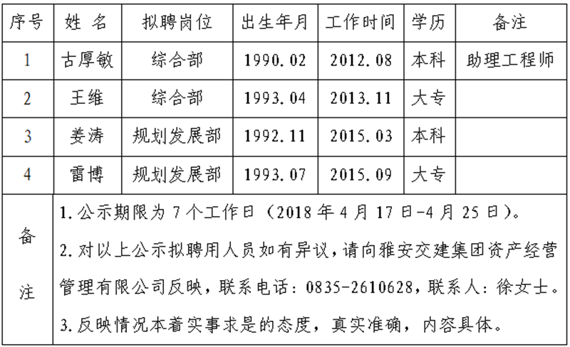 通過公開報名、資格審查、面試等程序,經(jīng)雅安交建集團(tuán)資產(chǎn)經(jīng)營管理有限公司研究擇優(yōu)確定以下4名擬聘用人員,現(xiàn)公示名單如下: