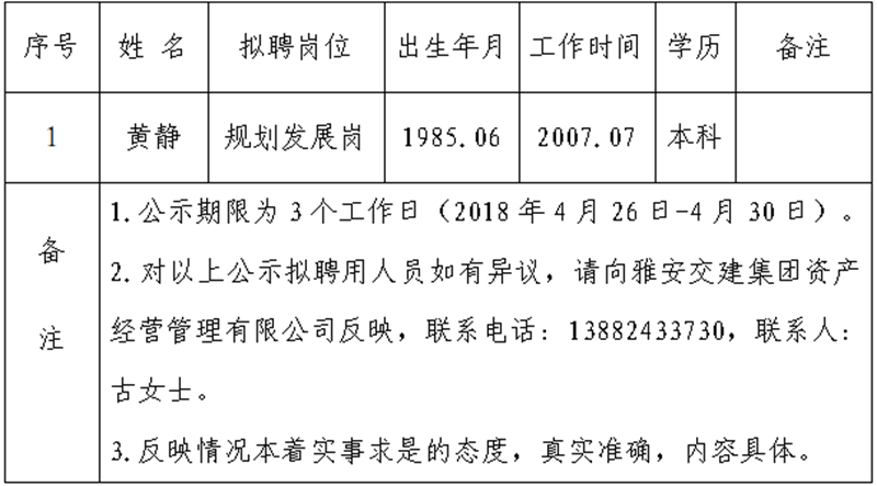雅安交建集團(tuán)資產(chǎn)經(jīng)營(yíng)管理有限公司擬聘用人員公示