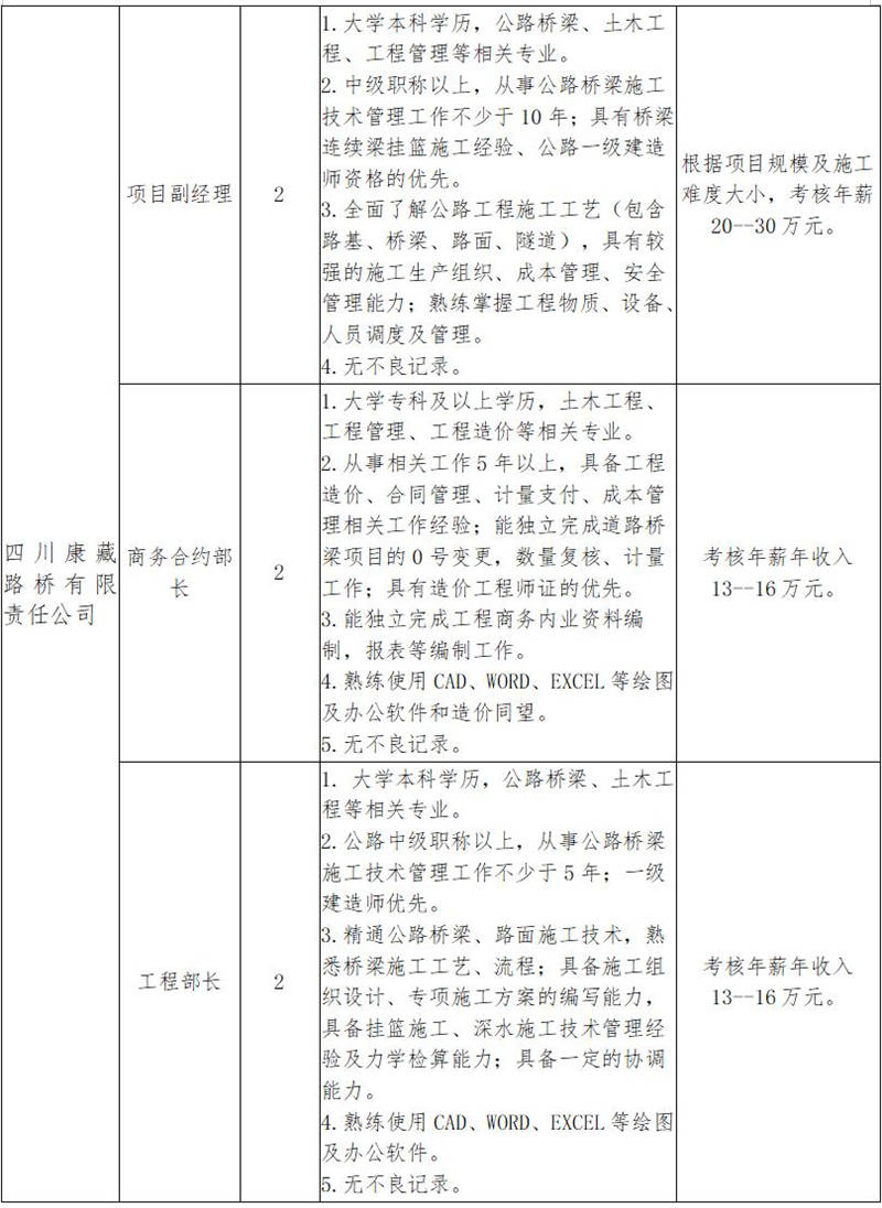 根據(jù)發(fā)展需要,決定面向社會公開招聘雅安市交通建設(shè)(集團)有限責(zé)任公司(以下簡稱“雅安交建集團”)所屬子公司工程項目主要負(fù)責(zé)人10名,現(xiàn)將有關(guān)事項公告如下: