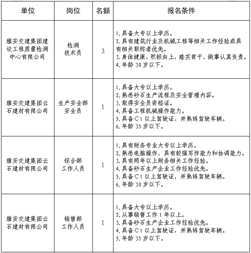 根據(jù)發(fā)展需要,決定面向社會公開招聘雅安市交通建設(shè)(集團)有限責(zé)任公司(以下簡稱“雅安交建集團”)所屬子公司工作人員6名,現(xiàn)將有關(guān)事項公告如下: