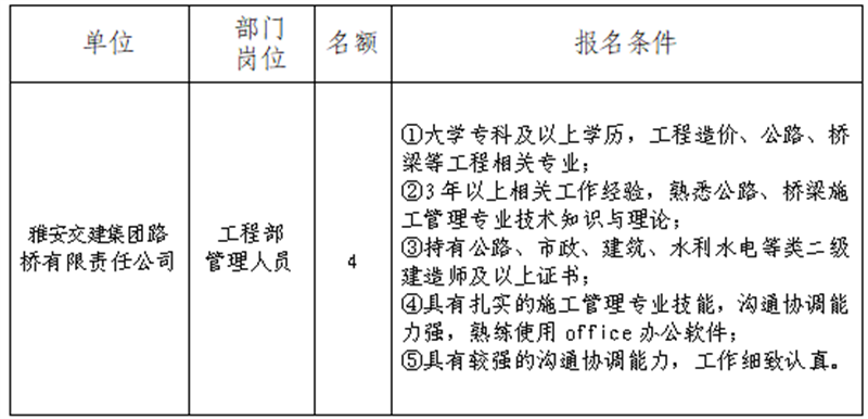 根據(jù)發(fā)展需要,決定面向社會(huì)公開招聘雅安市交通建設(shè)(集團(tuán))有限責(zé)任公司(以下簡(jiǎn)稱“雅安交建集團(tuán)”)所屬子公司工作人員4名,現(xiàn)將有關(guān)事項(xiàng)公告如下: