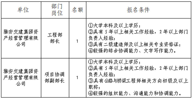 根據(jù)發(fā)展需要,決定面向社會公開招聘雅安市交通建設(集團)有限責任公司(以下簡稱“雅安交建集團”)所屬子公司工作人員2名,現(xiàn)將有關(guān)事項公告如下: