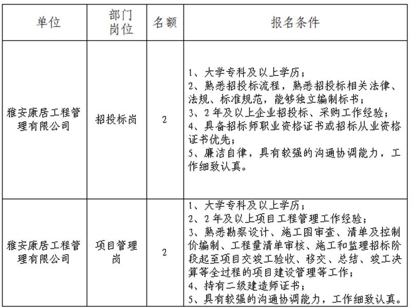 根據(jù)發(fā)展需要,決定面向社會(huì)公開(kāi)招聘雅安市交通建設(shè)(集團(tuán))有限責(zé)任公司(以下簡(jiǎn)稱“雅安交建集團(tuán)”)所屬子公司工作人員4名,現(xiàn)將有關(guān)事項(xiàng)公告如下: